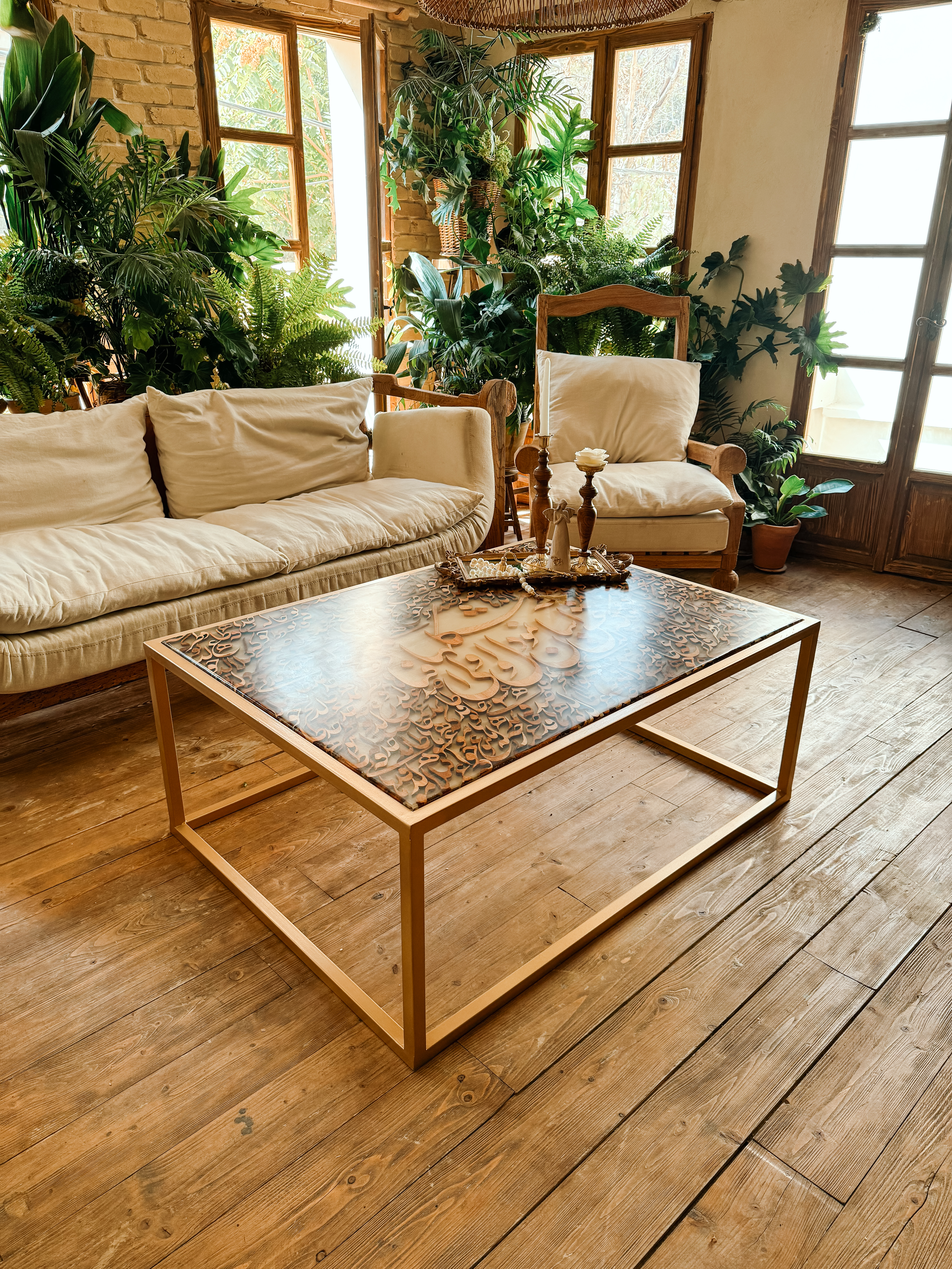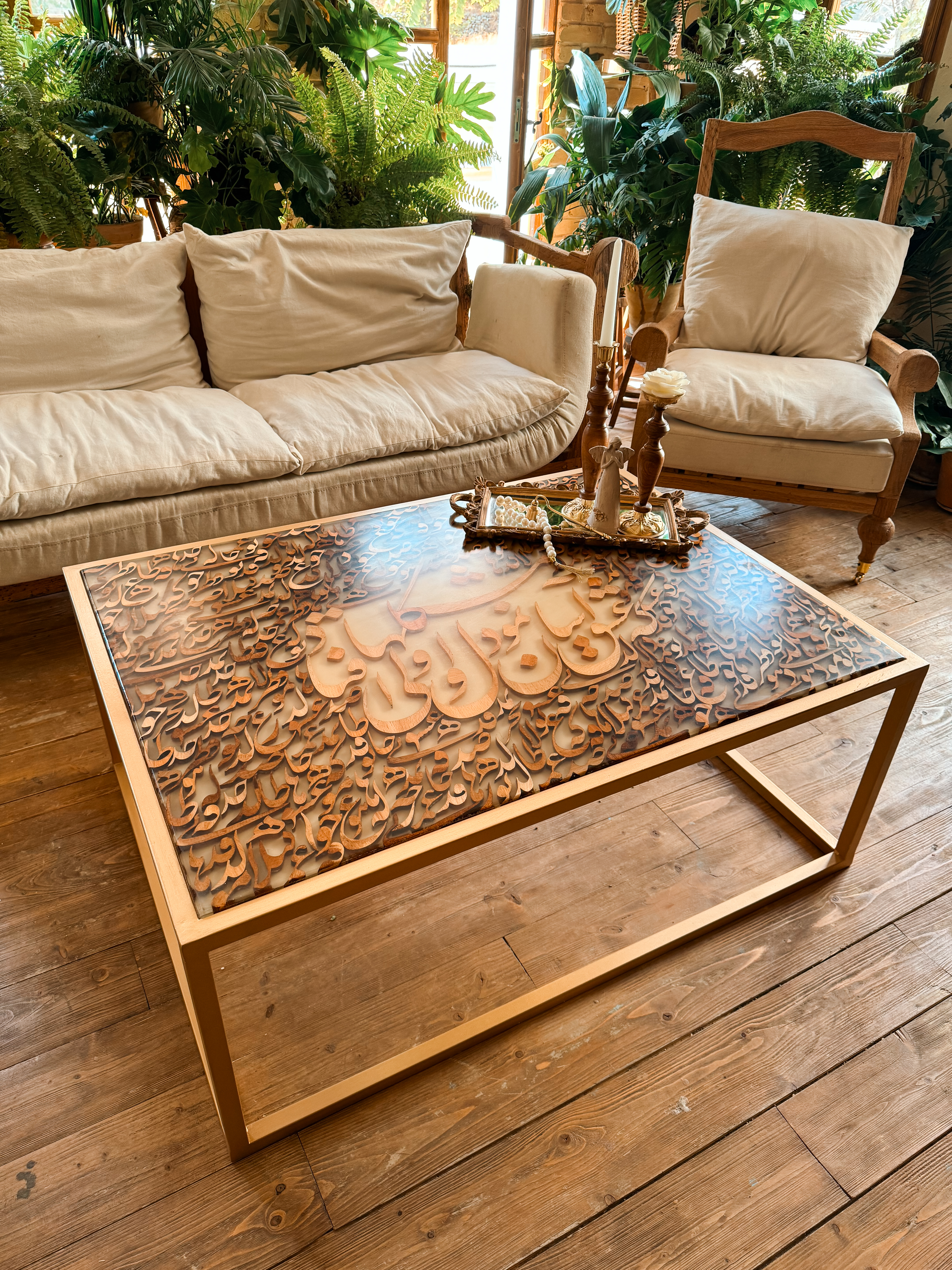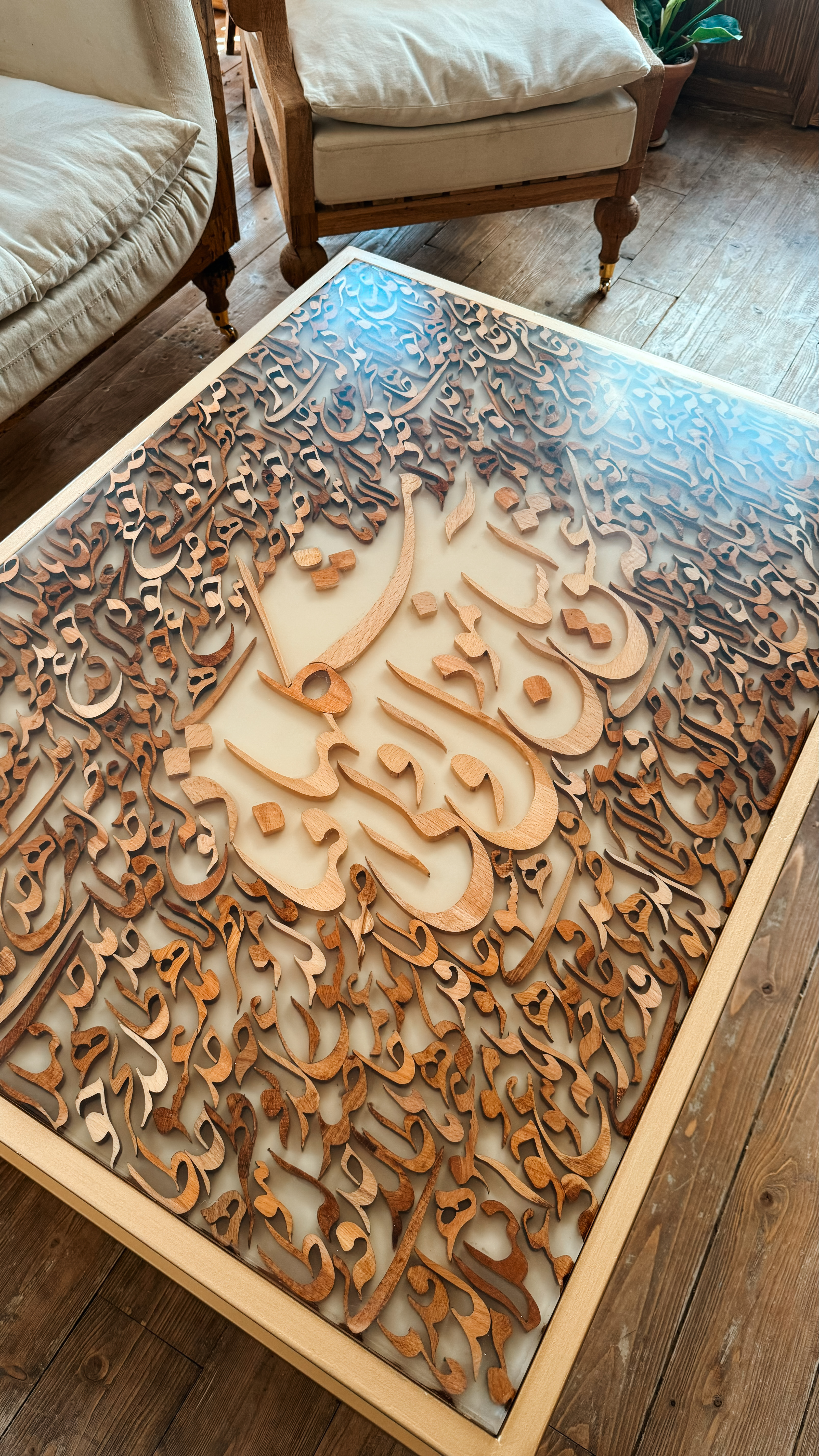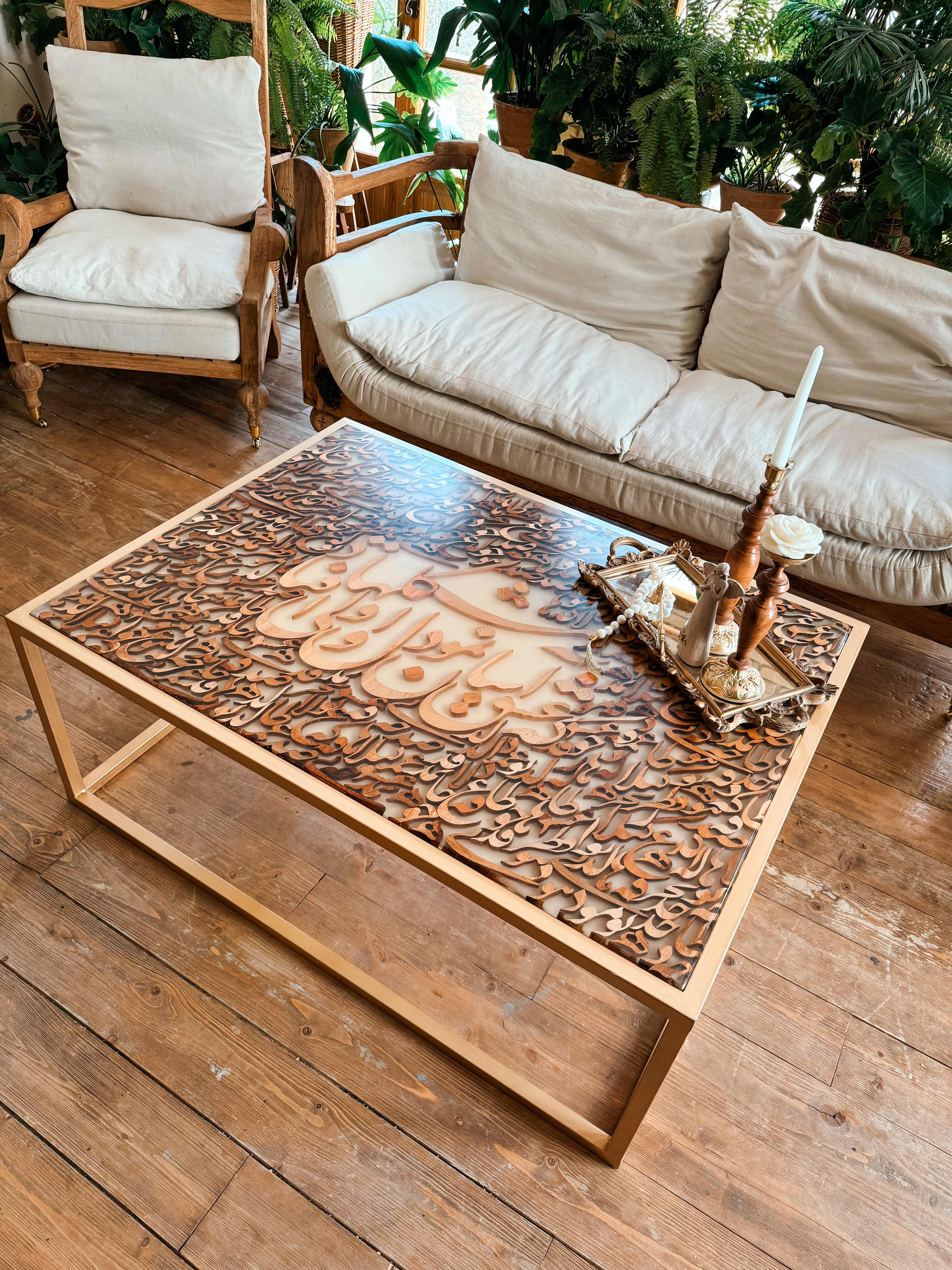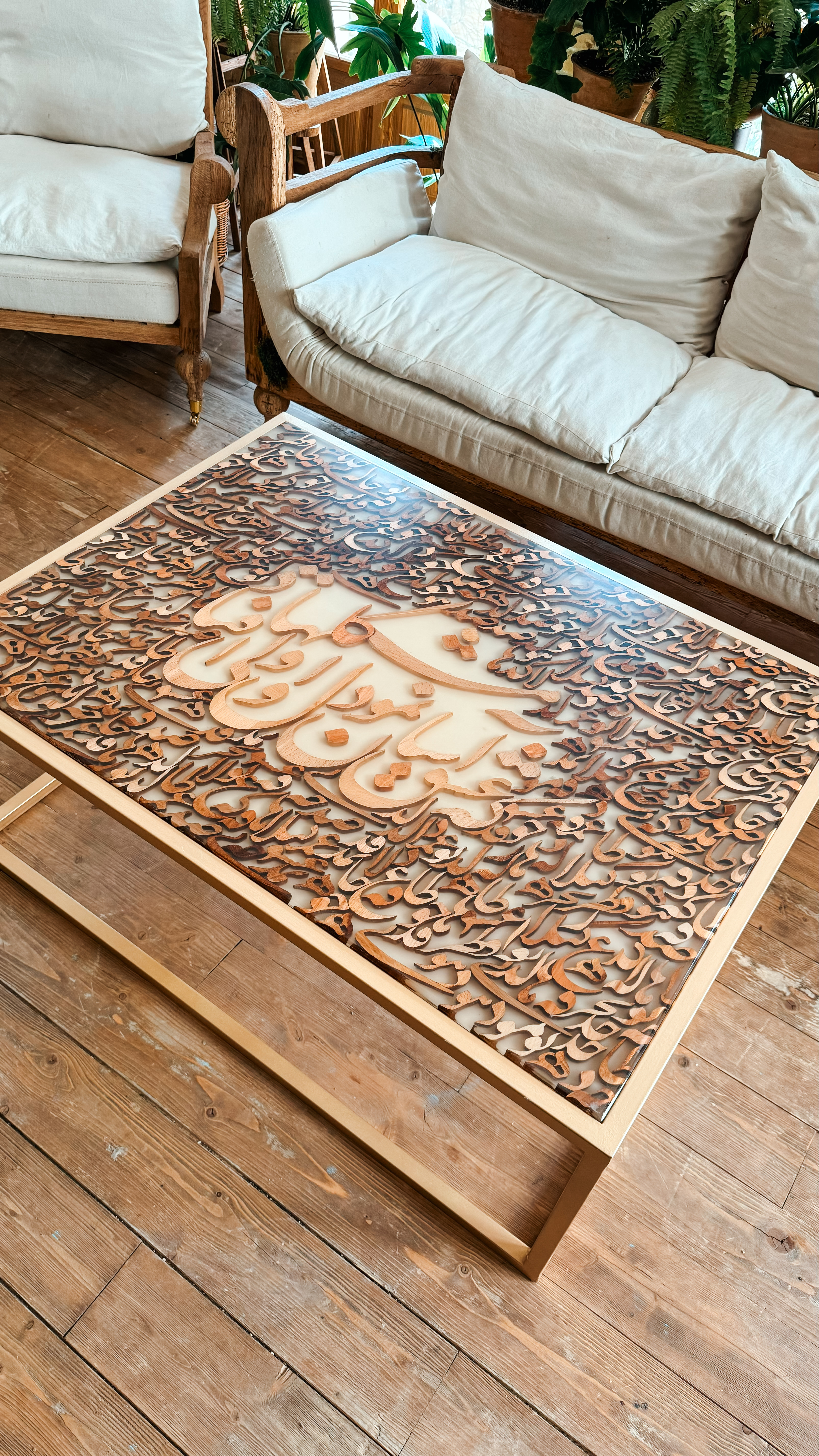 ترکیب شعر حافظ و هنر خطاطی و صنعت چوب محصولی رو پیشکش شما هموطن گرامی میکنه که نه در گذر زمان از مد میفته و نه نگاه از دیدنش سیر میشه.که عشق آسان نمود اول ولی افتاد مشکلها فقط یک مصرع از شعر نیست. راز وجود تمامی خلقت و مفهوم بودن هست. ابعاد این میز شامل عرض ۸۵ سانت و طول ۱۰۵ سانت میباشد که با پایه استیل طراحی کار رو تلفیق میکنه با هر دکور مدرن یا کلاسیک.