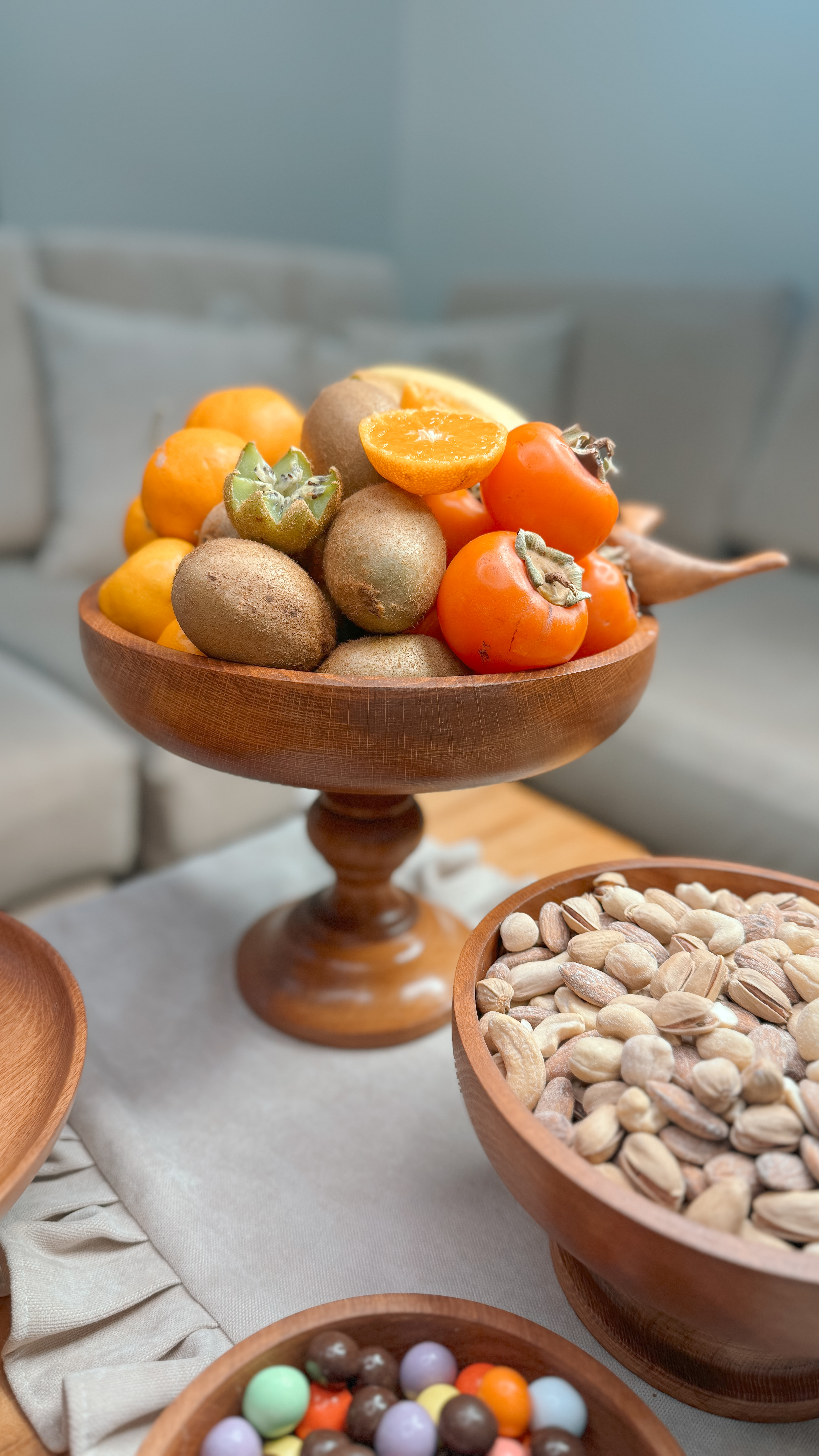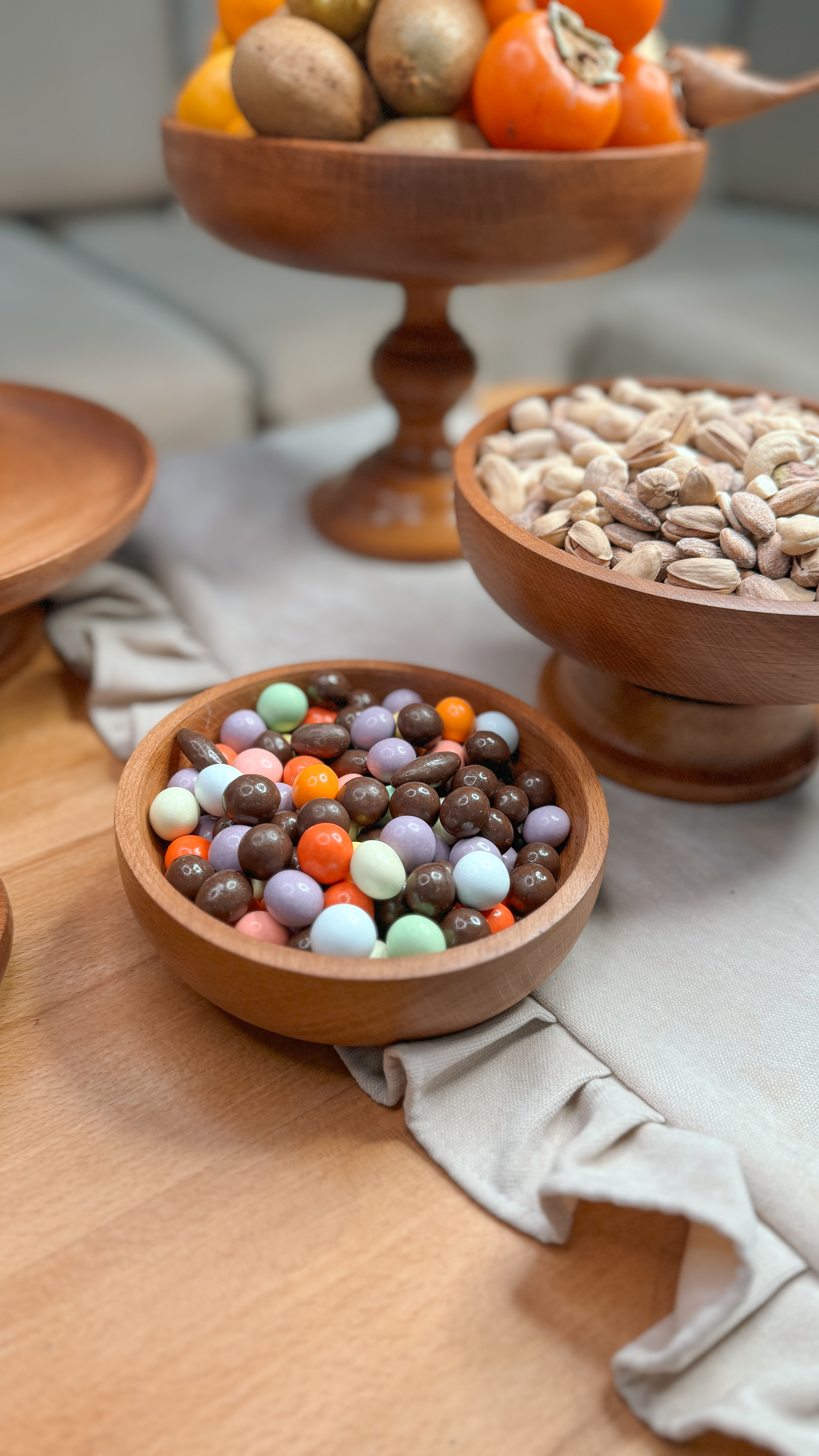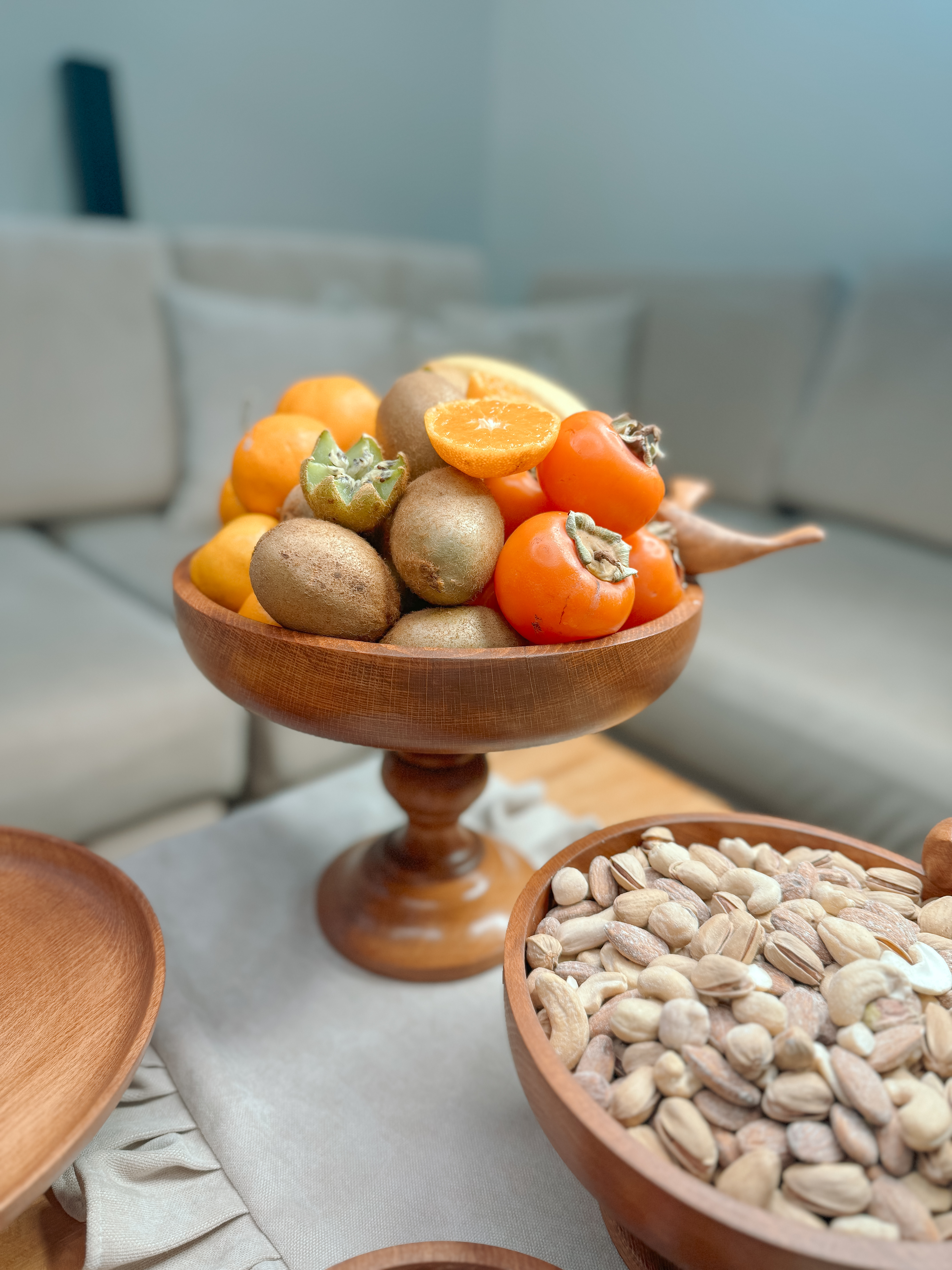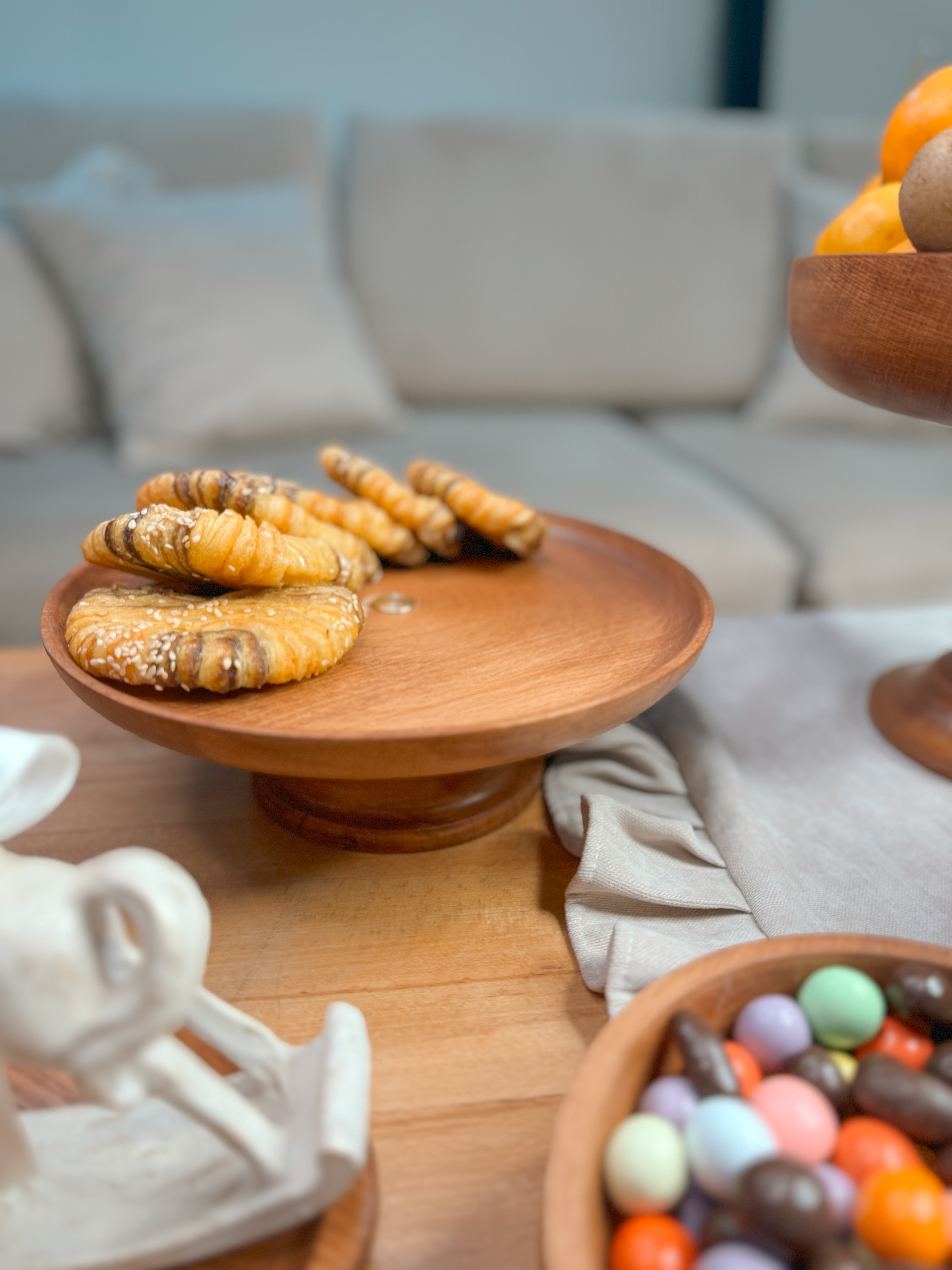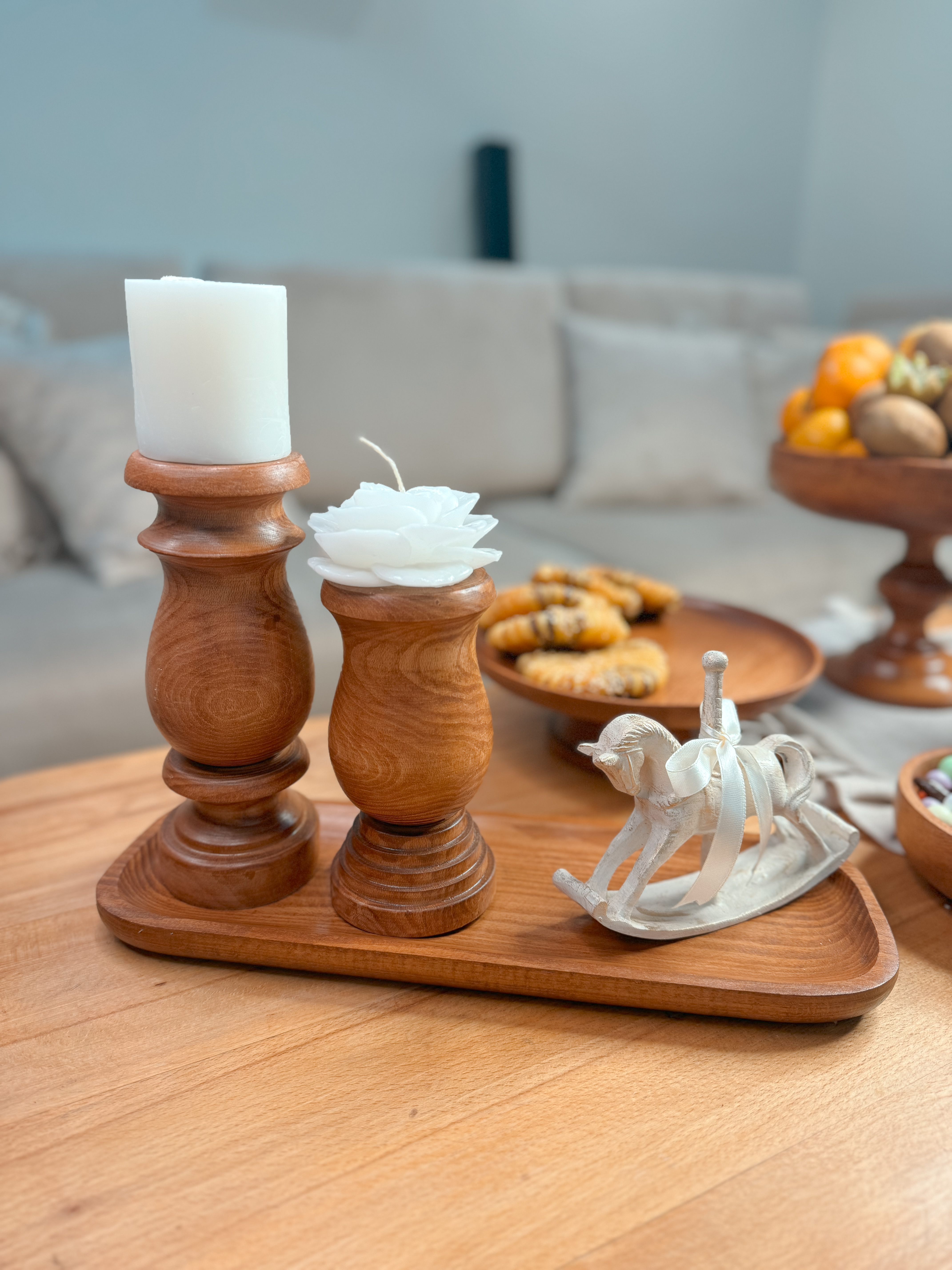 ساخته شده از چوب راش با پوشش گیاهی و آب گریز می باشد. اجزا این سرویس تشکیل شده از : میوه خوری ۲۵ سانت و آجیل خوری ۲۰ سانتیمتر و یک پیاله ۱۵سانت به عنوان شکلات خوری به همراه شیرینی خوری قطر ۲۳سانتیمتر و یک عدد رولت خوری و یک جفت جاشمعی ۱۵/۲۰ سانتیمتر به همراه شمع و راکر اسب می باشد. 📍تفاوت رنگ در محصولات چوبی ماچوب یک متریال طبیعی و زنده است که دارای بافتها، رگهها و گرههای منحصربهفردیست. این ویژگیها باعث میشود هر قطعه چوب، رنگ و طرح خاص خود را داشته باشد و در نتیجه، ظروف چوبی ما نیز ممکن است تفاوتهایی در رنگ و بافت نسبت به یکدیگر داشته باشند؛ بهویژه در محصولات با رنگ عسلـی، این تفاوت بیشتر نمود پیدا میکند.برای شفافیت بیشتر، تصاویر واقعی و بدون ویرایش تمامی سفارشهای آماده ارسال، در صفحه دوم اینستاگراممان (@kajanchoob2) قرار داده شدهاند تا بتوانید نمای دقیقتری از تنوع طبیعی محصولات داشته باشید.امیدواریم مشاهده این تصاویر، شما را در انتخاب بهتر یاری کند.