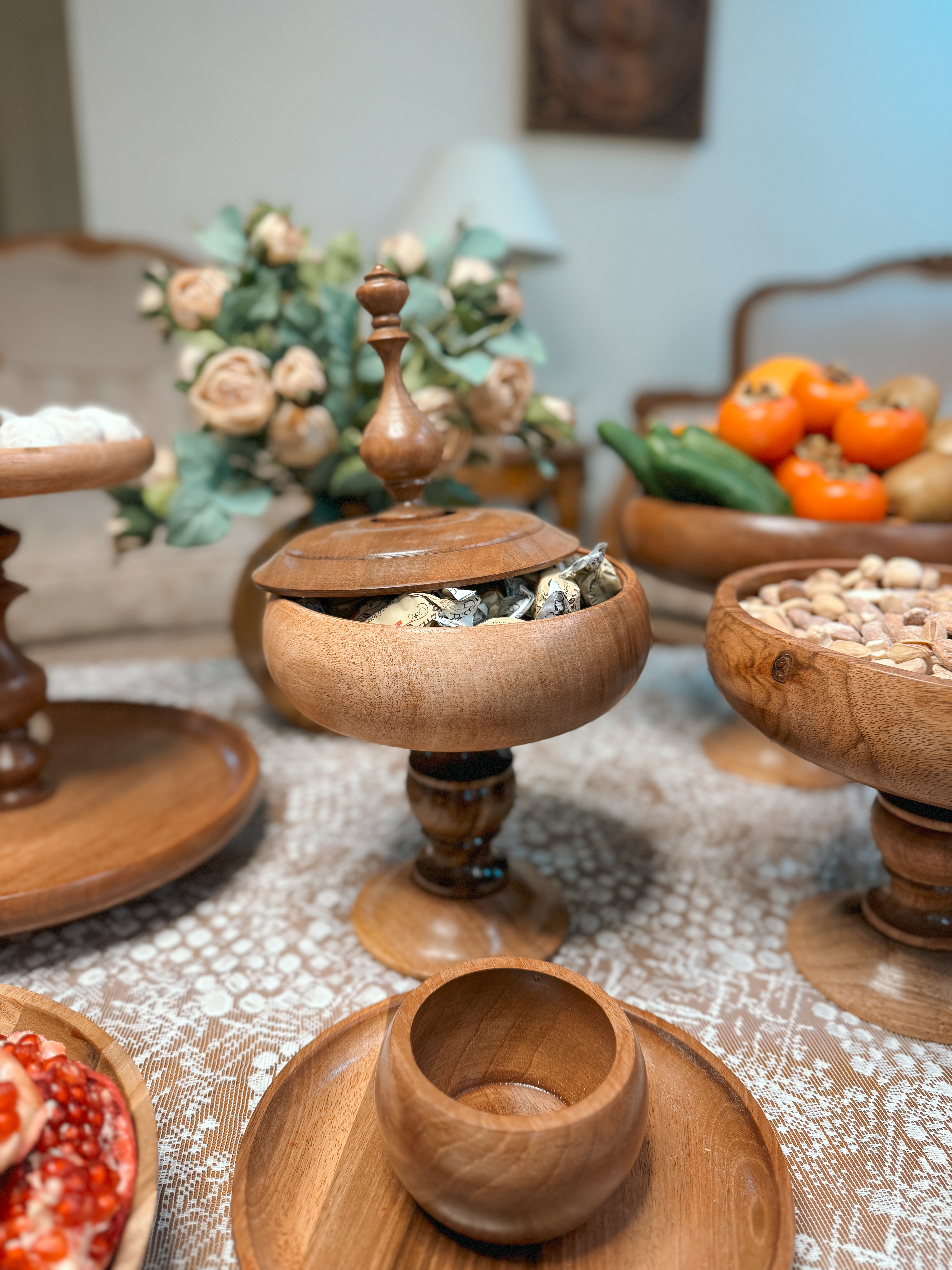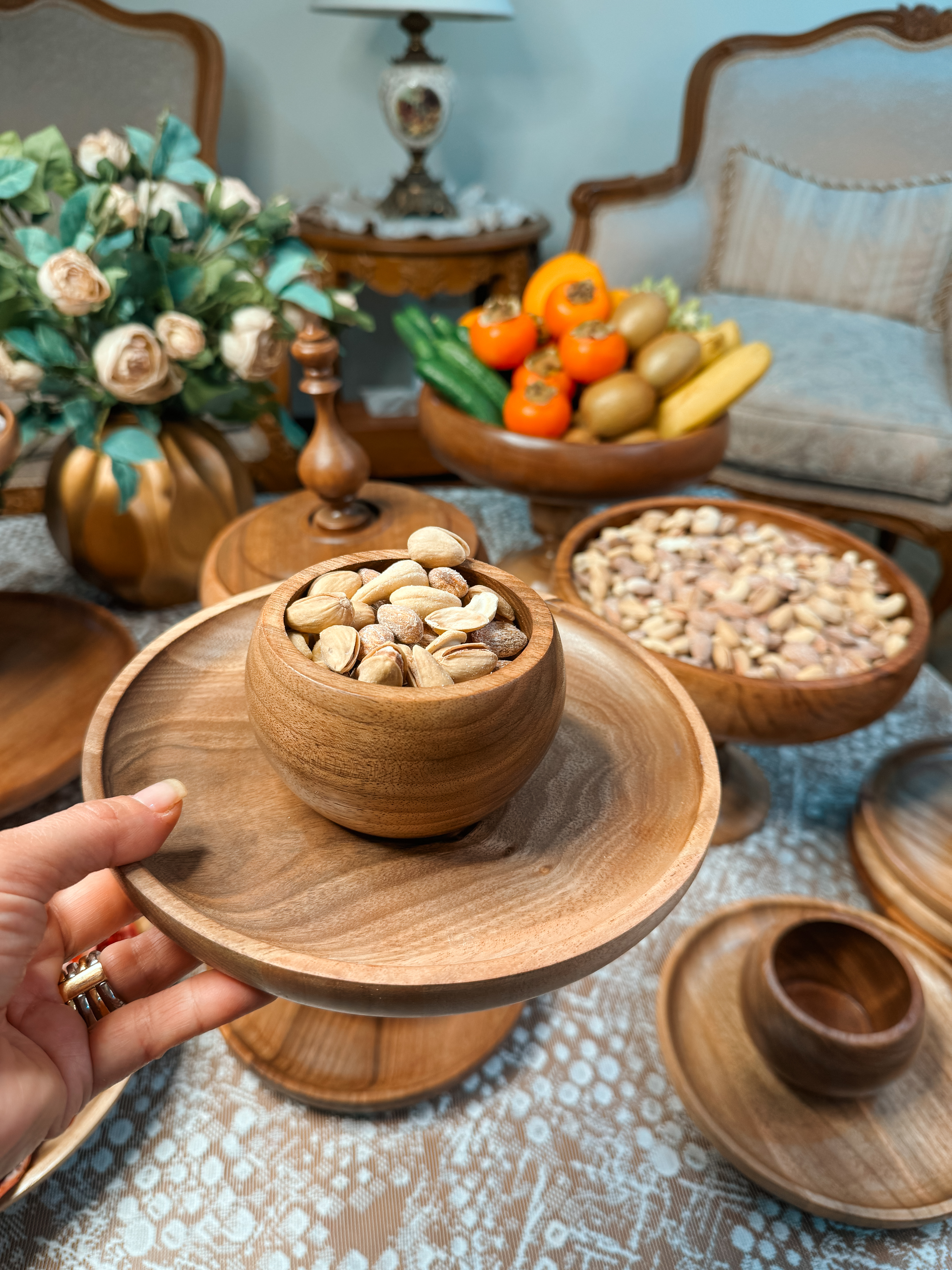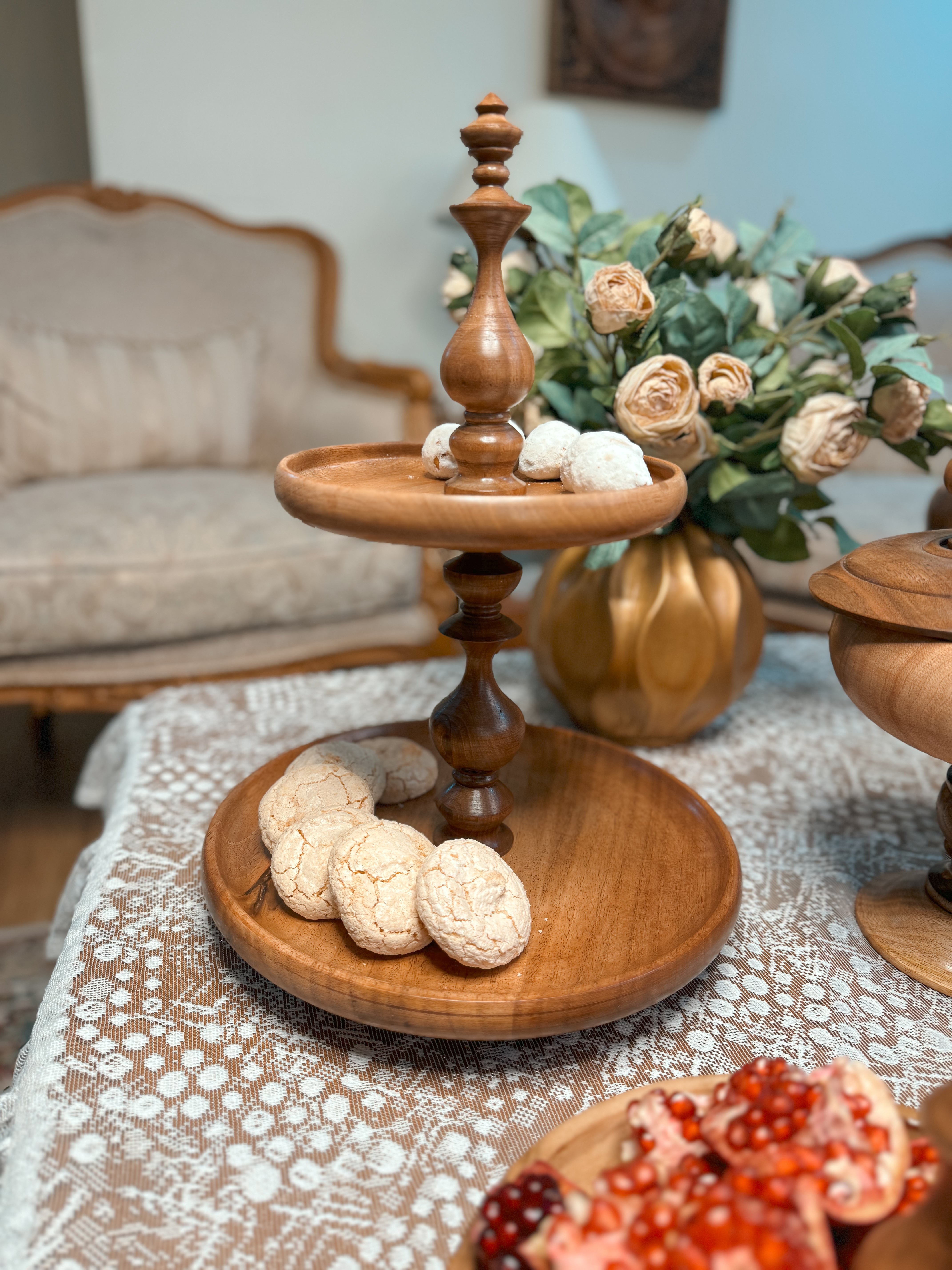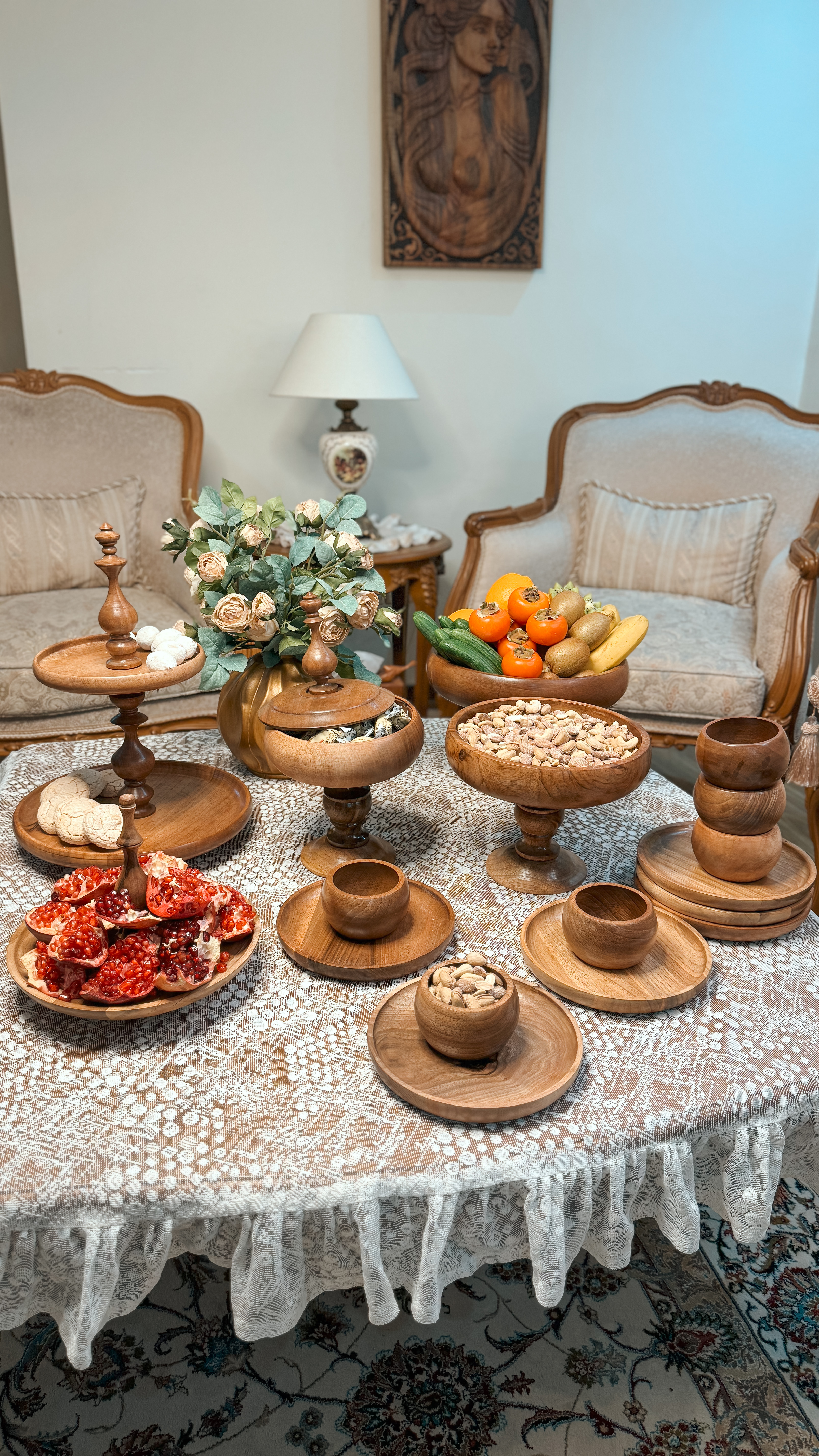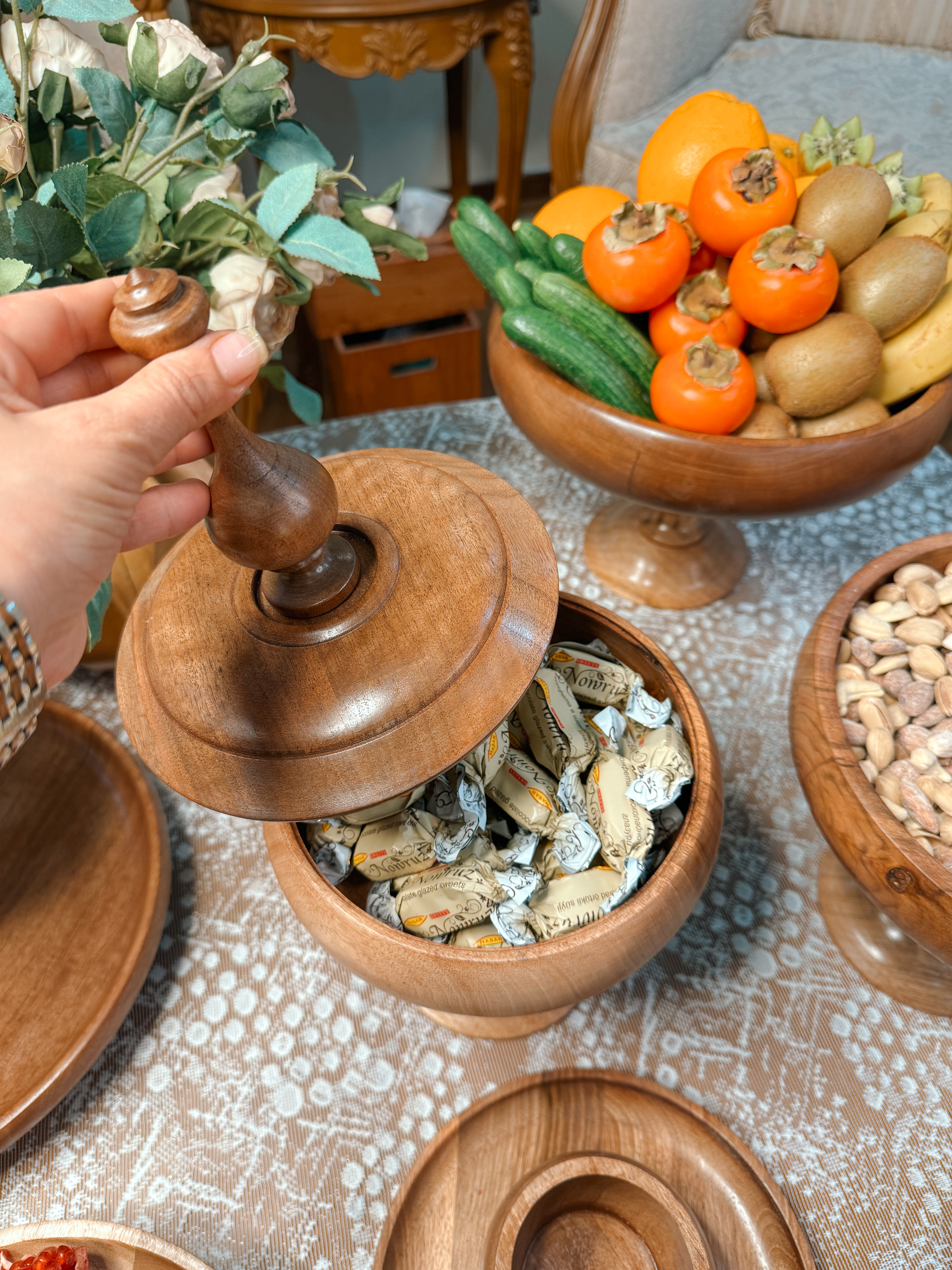 ساخته شده از چوب گردو با پوشش گیاهی و آب گریز می باشد. اجزا این سرویس تشکیل شده از : میوه خوری ۳۰ سانتیمتر،آجیل خوری ۲۵ سانتیمتر و شکلات خوری درب دار ۲۰ سانتیمتر استند دو طبقه به قطر های ۲۳/۳۰ سانتیمتر و یک شیرینی خوری دسته دار به قطر ۲۵ سانتیمترو به همراه ۶عدد پیاله ۱۰ سانت و ۶عدد پیش دستی ۲۰ سانتیمتر می باشد .در مدل پرنده دار شکلات خوری درب دار ،پیشدستی،پیاله، پرنده کار نمی شود.📍تفاوت رنگ در محصولات چوبی ماچوب یک متریال طبیعی و زنده است که دارای بافتها، رگهها و گرههای منحصربهفردیست. این ویژگیها باعث میشود هر قطعه چوب، رنگ و طرح خاص خود را داشته باشد و در نتیجه، ظروف چوبی ما نیز ممکن است تفاوتهایی در رنگ و بافت نسبت به یکدیگر داشته باشند؛ بهویژه در محصولات با رنگ عسلـی، این تفاوت بیشتر نمود پیدا میکند.برای شفافیت بیشتر، تصاویر واقعی و بدون ویرایش تمامی سفارشهای آماده ارسال، در صفحه دوم اینستاگراممان (@kajanchoob2) قرار داده شدهاند تا بتوانید نمای دقیقتری از تنوع طبیعی محصولات داشته باشید.امیدواریم مشاهده این تصاویر، شما را در انتخاب بهتر یاری کند.