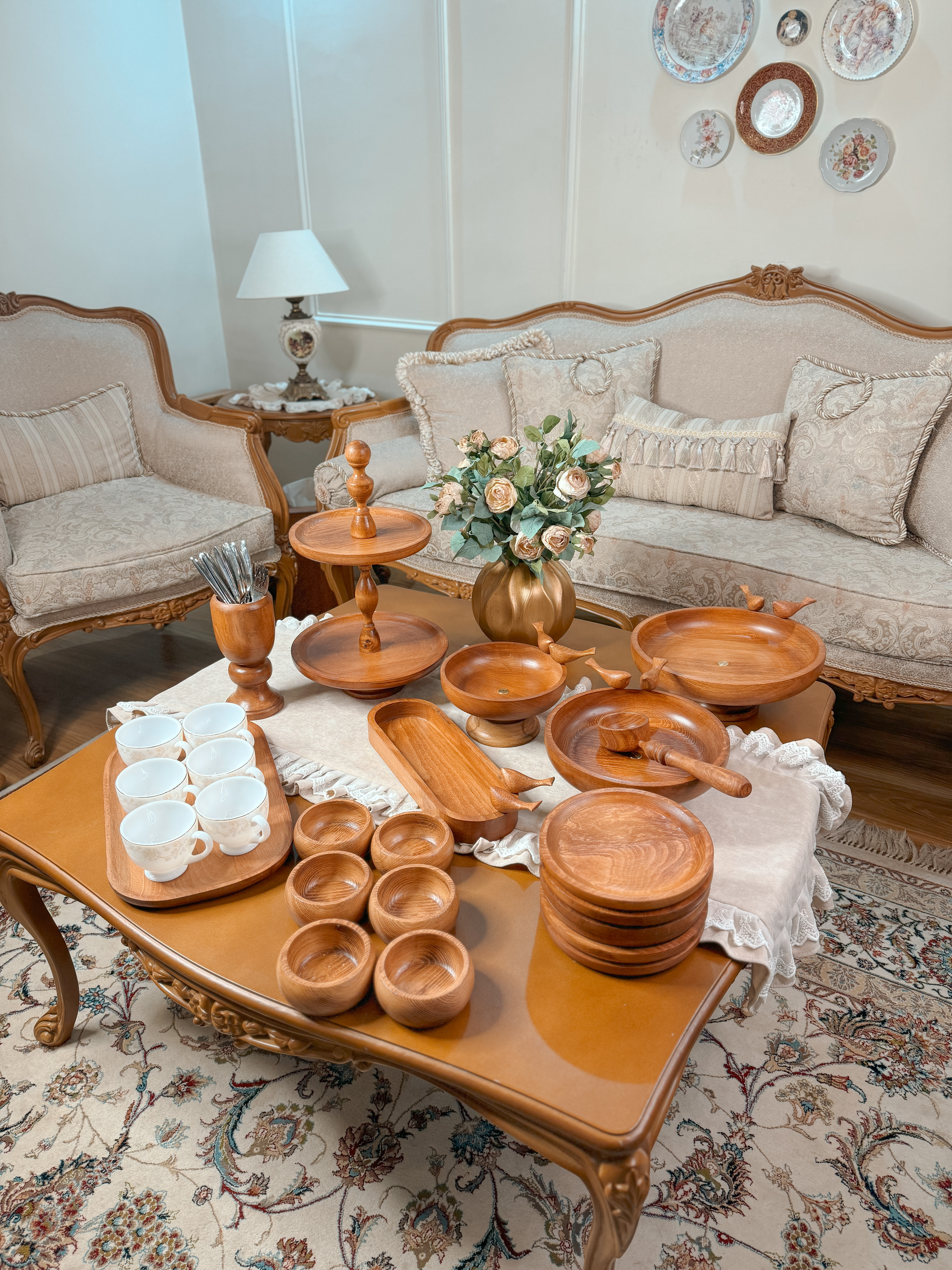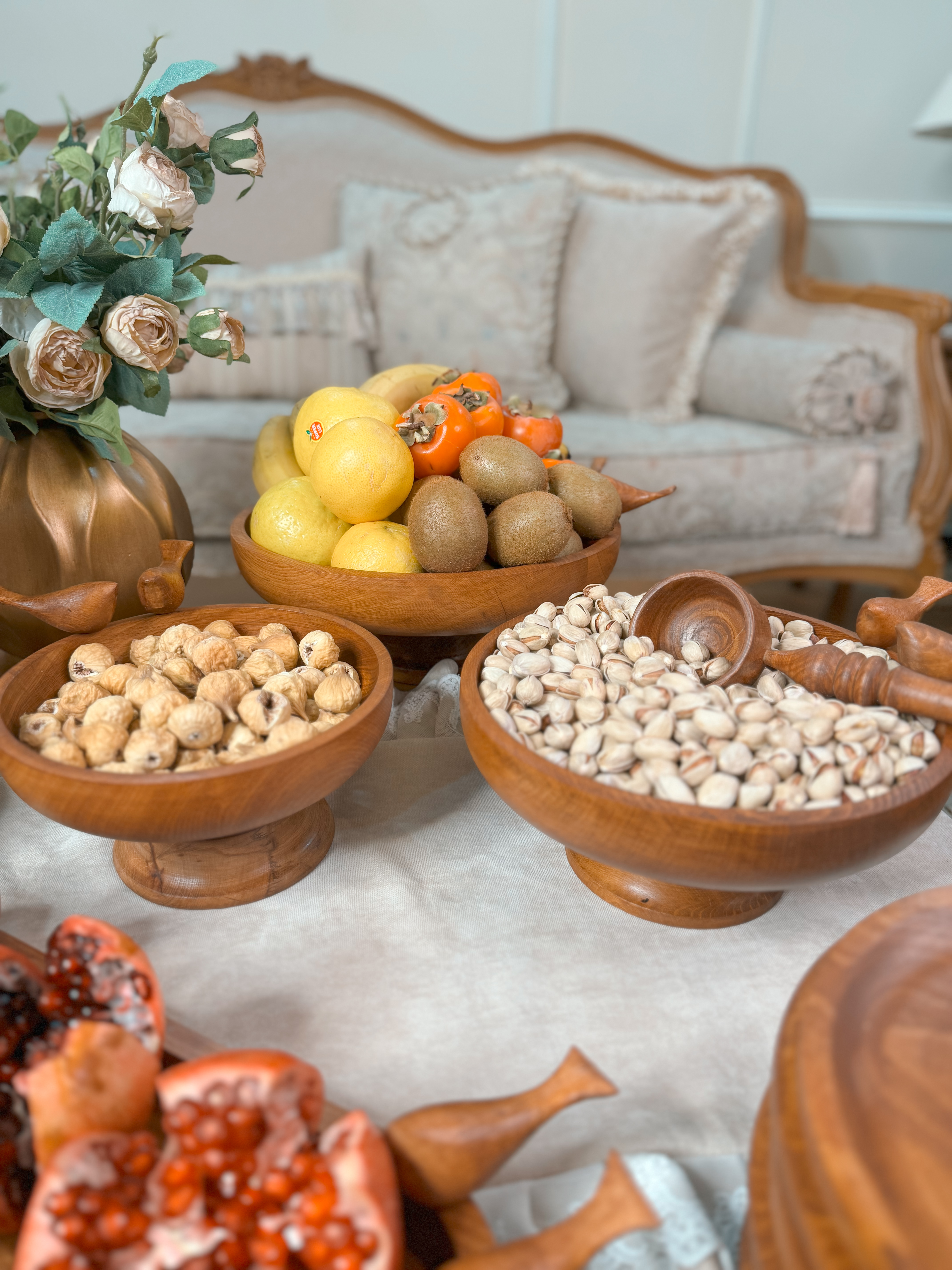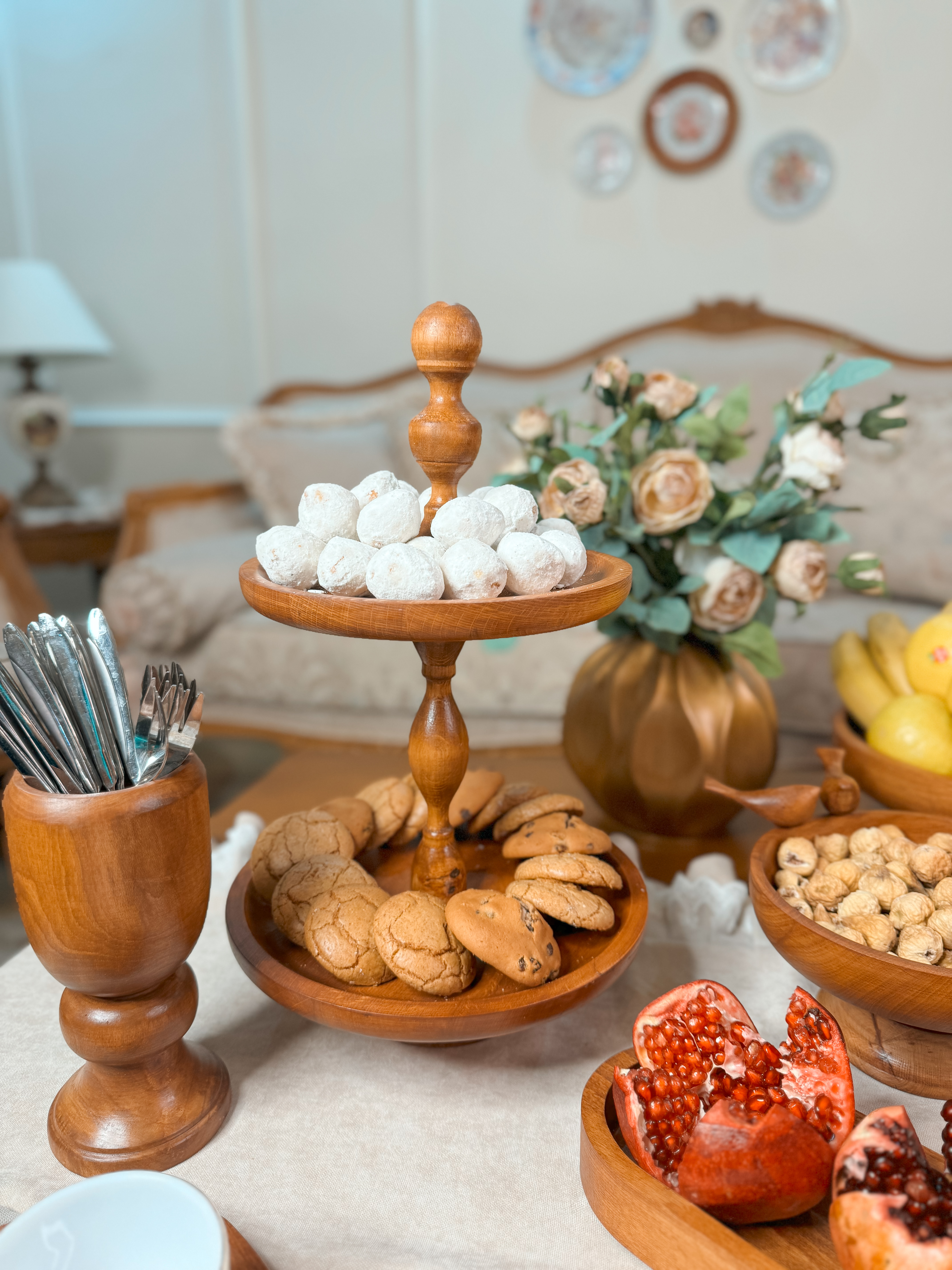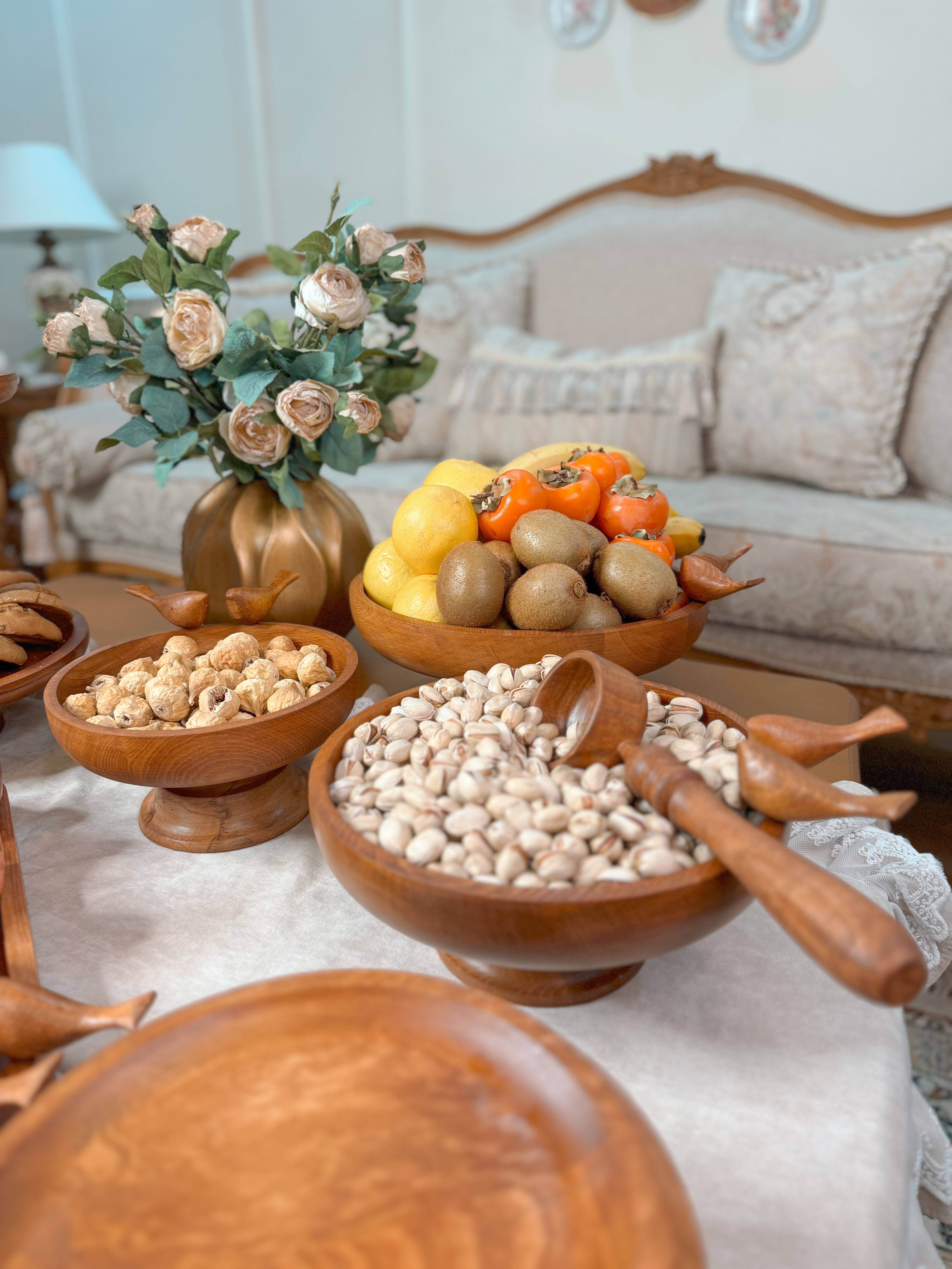 ساخته شده از چوب راش گرجستان با پوشش گیاهی و آب گریز می باشد. اجزا این سرویس تشکیل شده از : کاسه با قطرهای ۲۰,۲۵,۳۰ سانتیمتر،استند دو طبقه ۲۳/۲۷سانتیمتر و یک عدد دیس به ابعاد ۲۲/۳۸سانتیمتر و یک اردو بیضی به ابعاد ۱۲/۳۶ سانتیمتر به همراه ۶ عدد پیاله ۱۰ سانت و ۶ عدد پیش دست ۱۹ سانتیمتری و یک جاقاشقی به همراه قاشق آجیل دارد .در مدل پرنده دار ،پیشدستی،پیاله،جاقاشقی پرنده کار نمی شود.📍تفاوت رنگ در محصولات چوبی ماچوب یک متریال طبیعی و زنده است که دارای بافتها، رگهها و گرههای منحصربهفردیست. این ویژگیها باعث میشود هر قطعه چوب، رنگ و طرح خاص خود را داشته باشد و در نتیجه، ظروف چوبی ما نیز ممکن است تفاوتهایی در رنگ و بافت نسبت به یکدیگر داشته باشند؛ بهویژه در محصولات با رنگ عسلـی، این تفاوت بیشتر نمود پیدا میکند.برای شفافیت بیشتر، تصاویر واقعی و بدون ویرایش تمامی سفارشهای آماده ارسال، در صفحه دوم اینستاگراممان (@kajanchoob2) قرار داده شدهاند تا بتوانید نمای دقیقتری از تنوع طبیعی محصولات داشته باشید.امیدواریم مشاهده این تصاویر، شما را در انتخاب بهتر یاری کند.