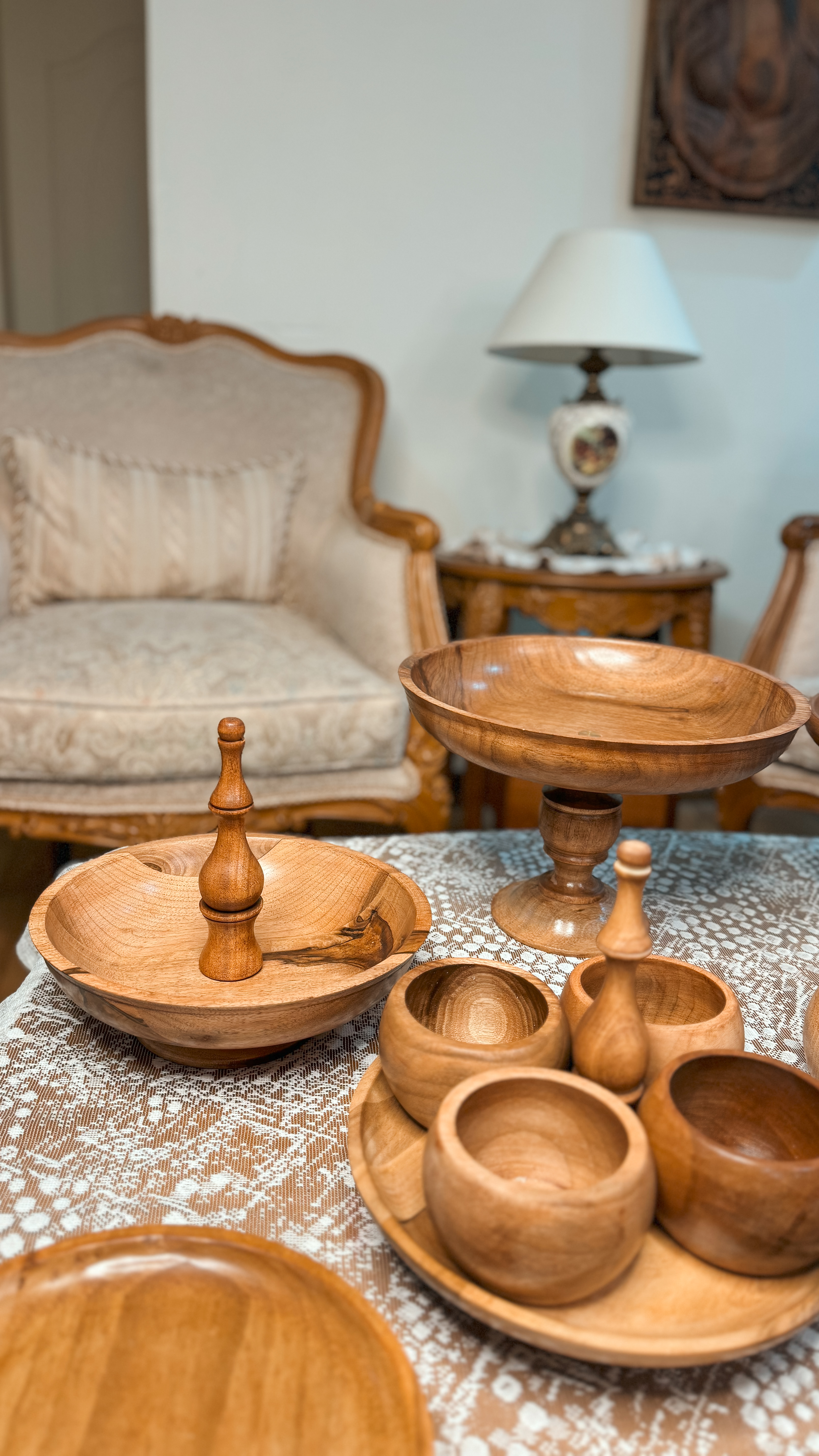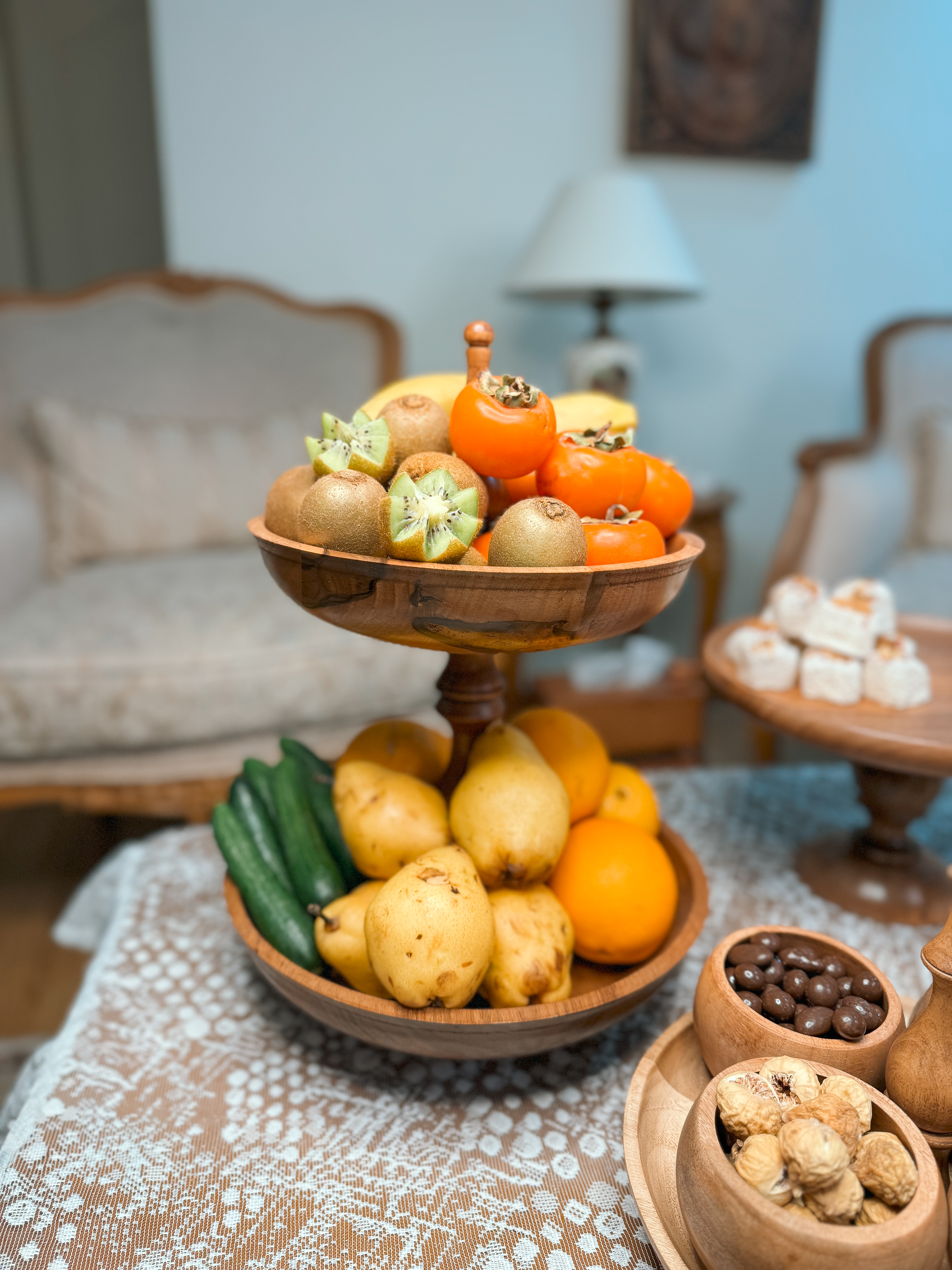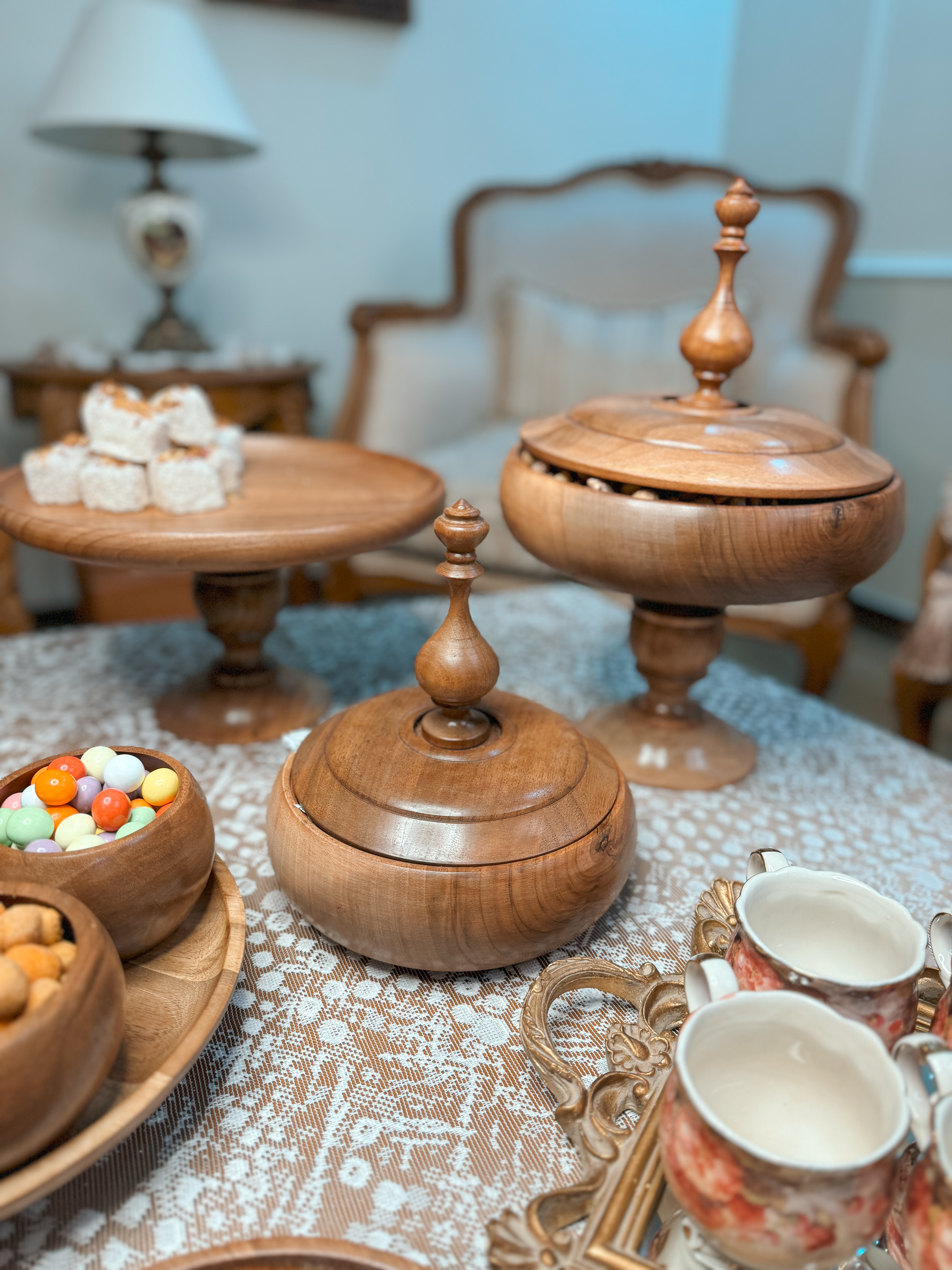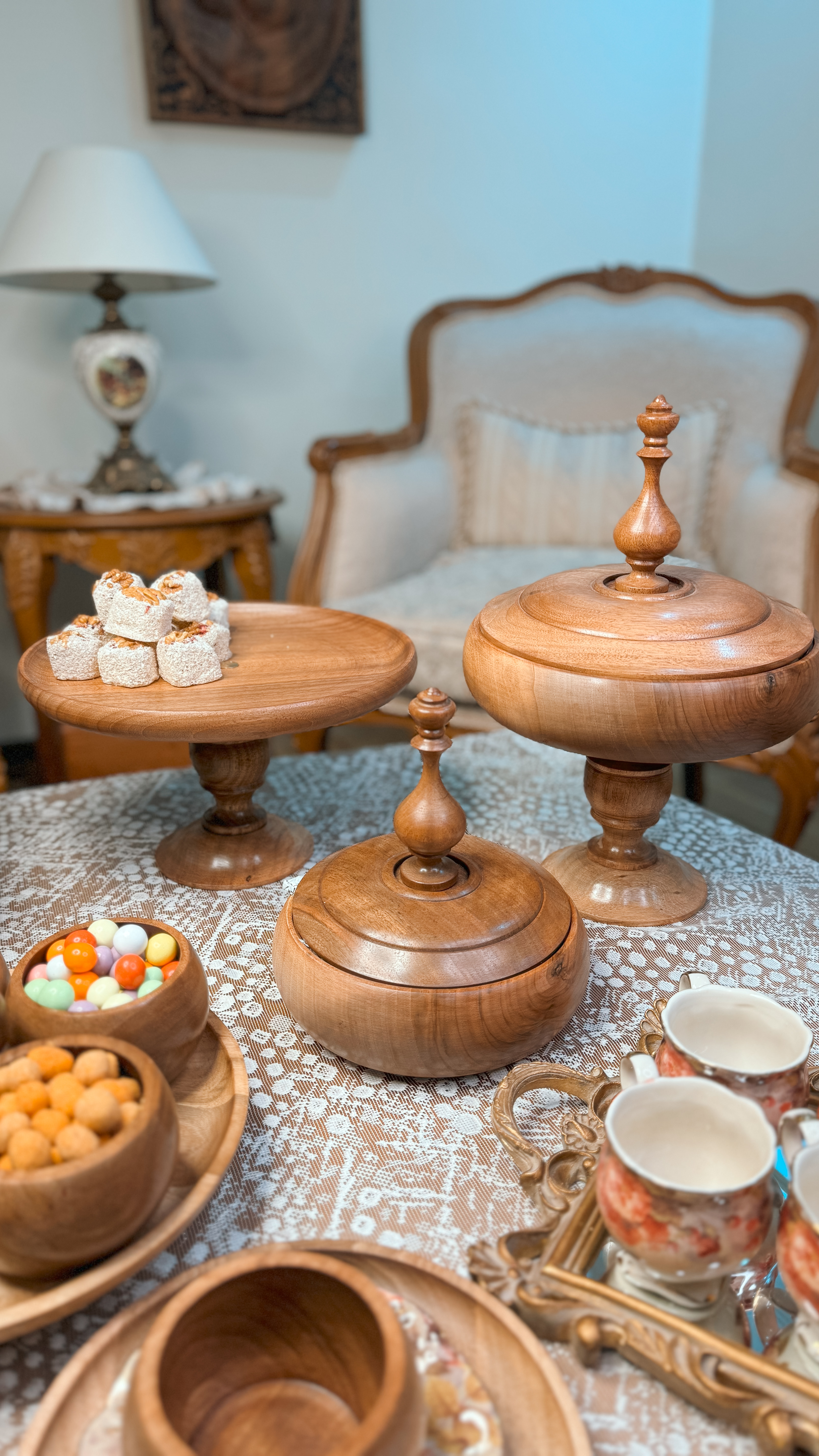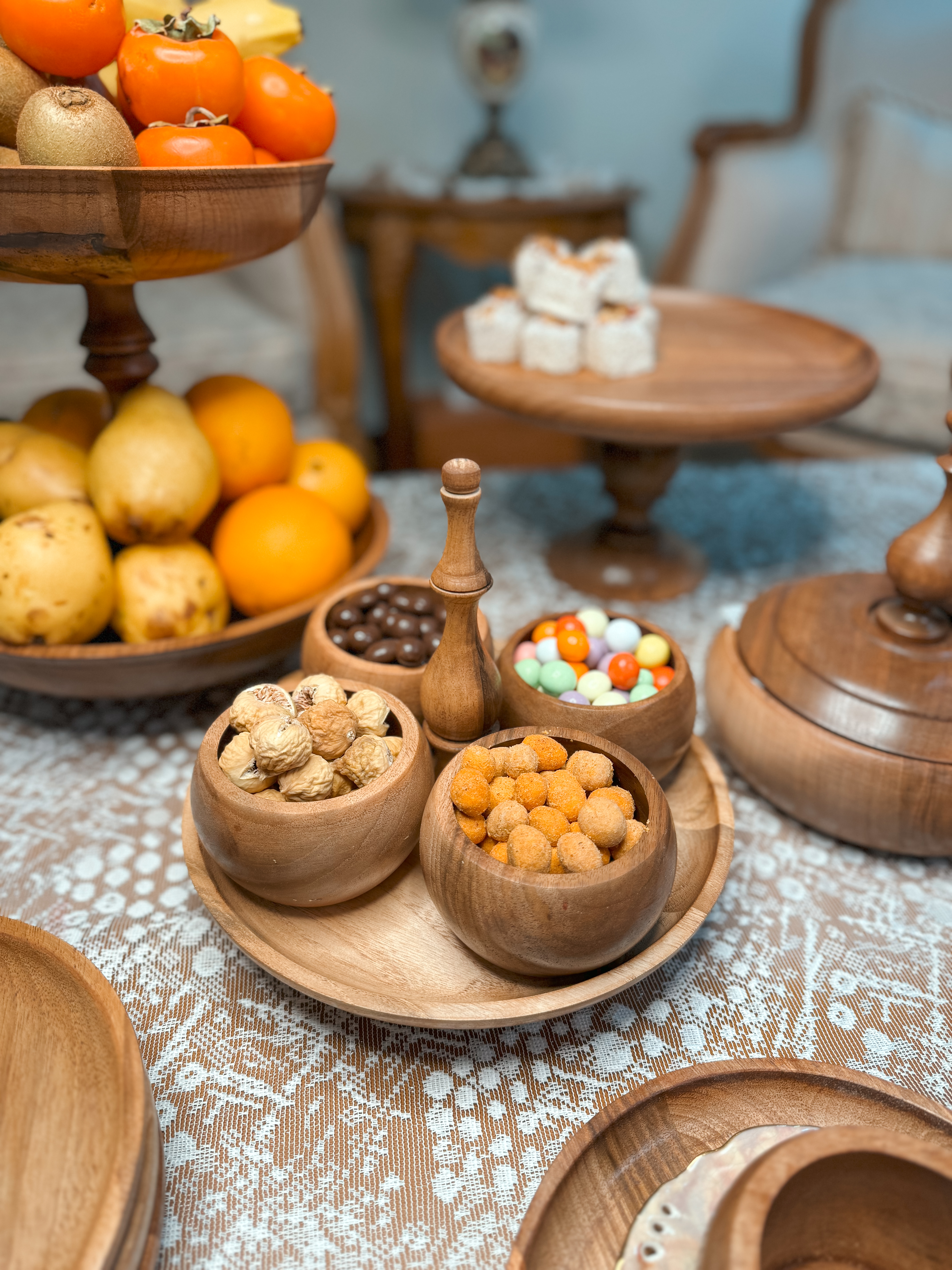 ساخته شده از چوب گردو با پوشش گیاهی و آب گریز می باشد. اجزا این سرویس تشکیل شده از : میوه خوری دو طبقه به قطر های ۲۵/۳۰ سانتیمتر،شیرینی خوری ۳۰ سانتیمتر و یک آجیل خوری درب دار ۲۵ سانت و شکلات خوری درب دار ۲۰ سانتیمتر و یک شیرینی خوری دسته دار قطر ۲۵ سانت و شش عدد پیاله ۱۰ سانتی و شش عدد پیش دستی ۲۰ سانتیمتری می باشد.در اسلاید های بعدی مشاهده میکنید که میوه خوری دو طبقه رو با تلفیق پایه آجیل خوری مدل دوتا میوه خوری تک هم میتوانید استفاده کنید 📍تفاوت رنگ در محصولات چوبی ماچوب یک متریال طبیعی و زنده است که دارای بافتها، رگهها و گرههای منحصربهفردیست. این ویژگیها باعث میشود هر قطعه چوب، رنگ و طرح خاص خود را داشته باشد و در نتیجه، ظروف چوبی ما نیز ممکن است تفاوتهایی در رنگ و بافت نسبت به یکدیگر داشته باشند.