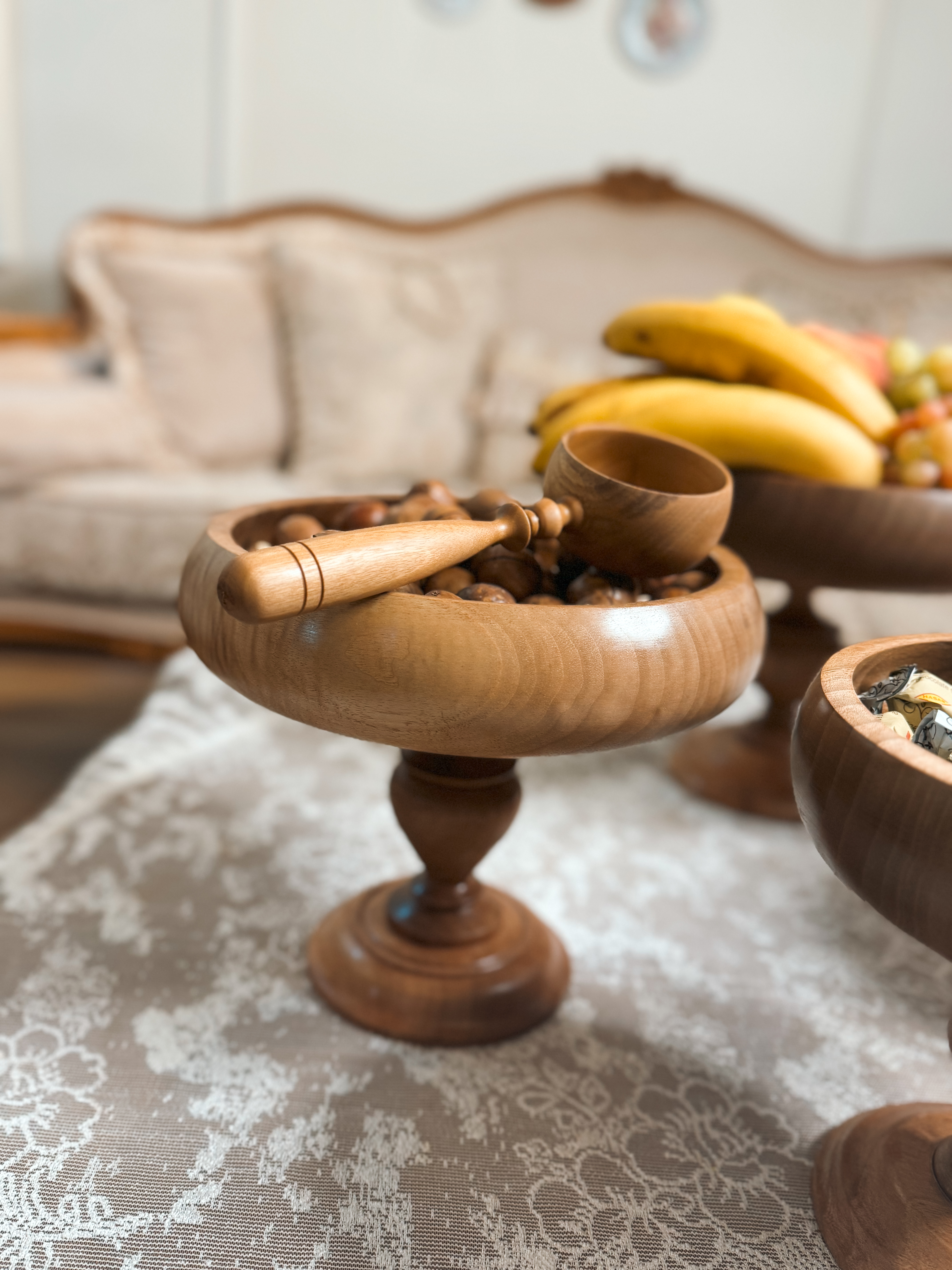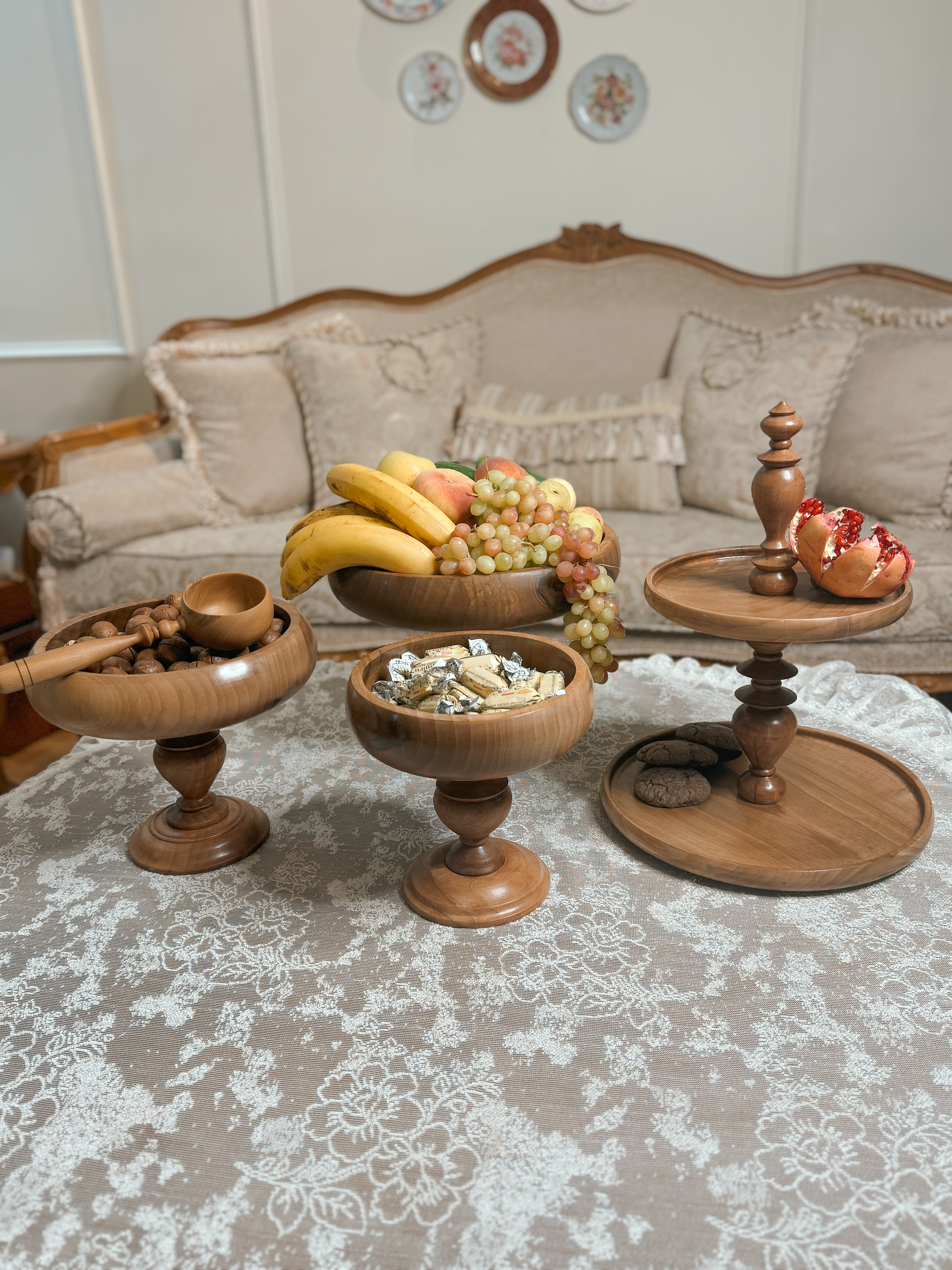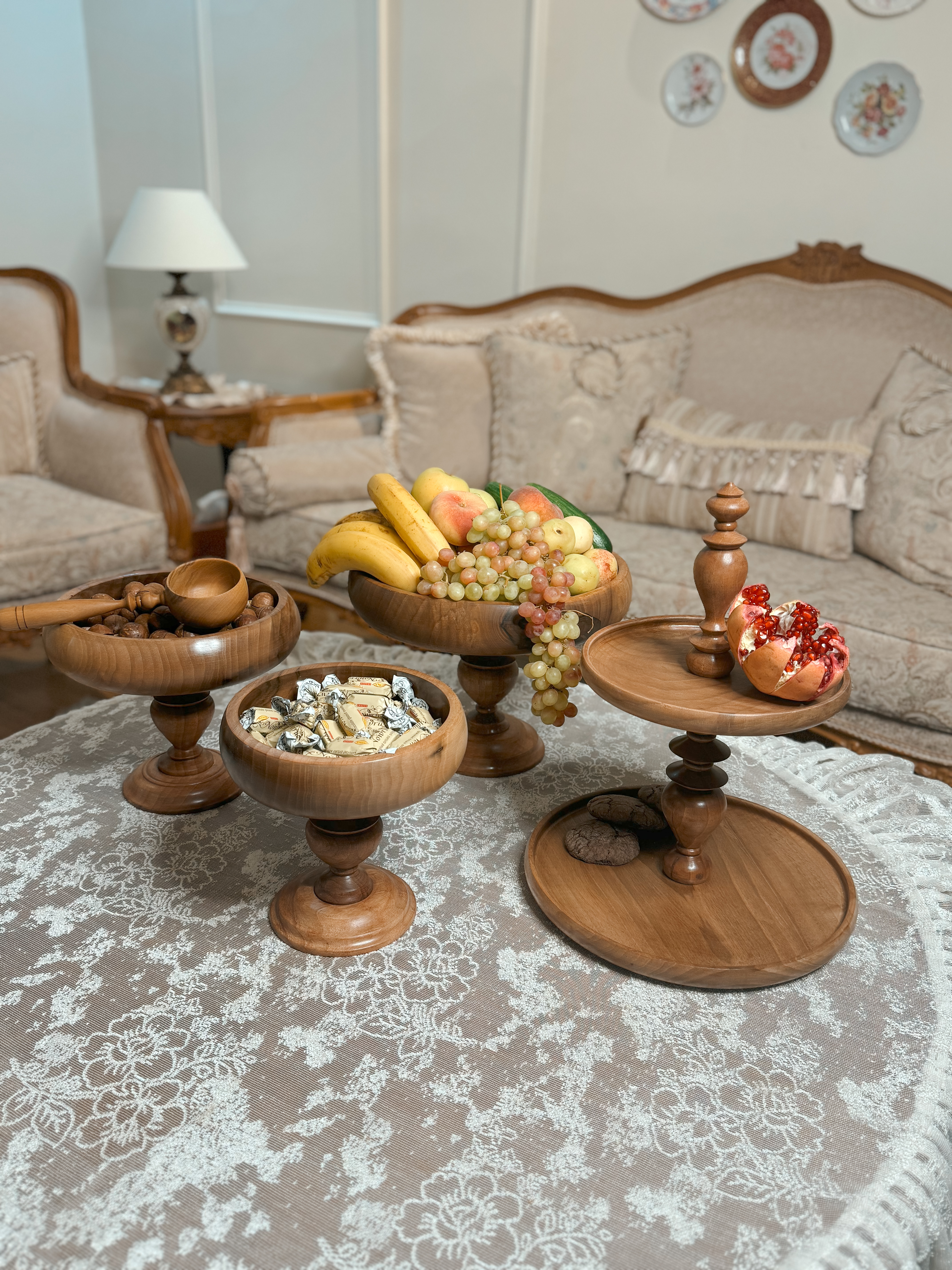 ساخته شده از چوب گردو با پوشش گیاهی و قابل شستشو اجزا سرویس تشکیل شده از میوه خوری ۳۰سانتیمتر آجیل خوری ۲۵ سانتیمتر،شکلات خوری ۲۰سانتیمتر ، و استند دو طبقه ۲۳/۳۰سانتیمتر و یک عدد قاشق آجیل می باشد.تمامی پایه ها مونتاژی می باشند و شما با پایه و بدون پایه میتونید سفارش بدید
