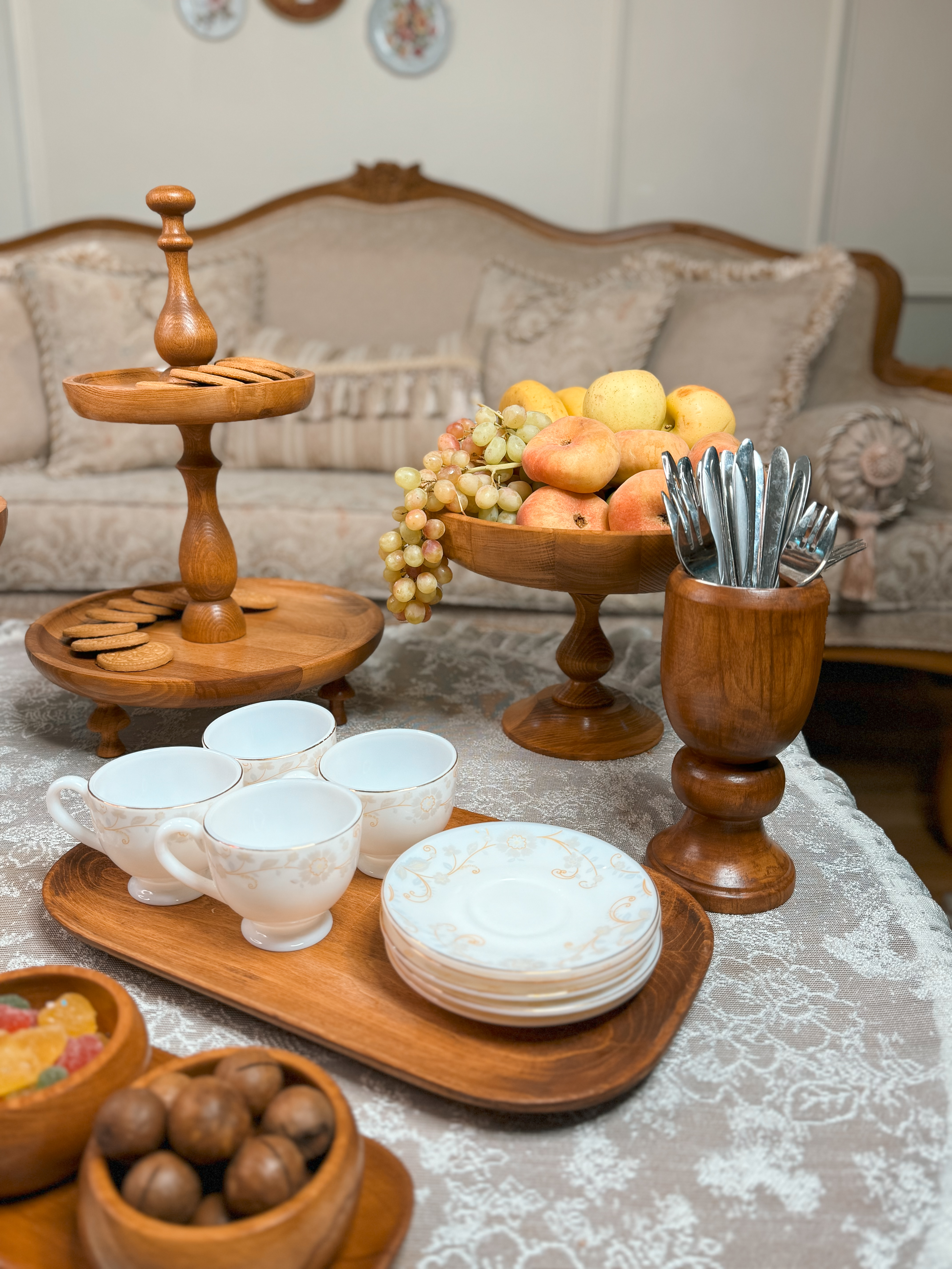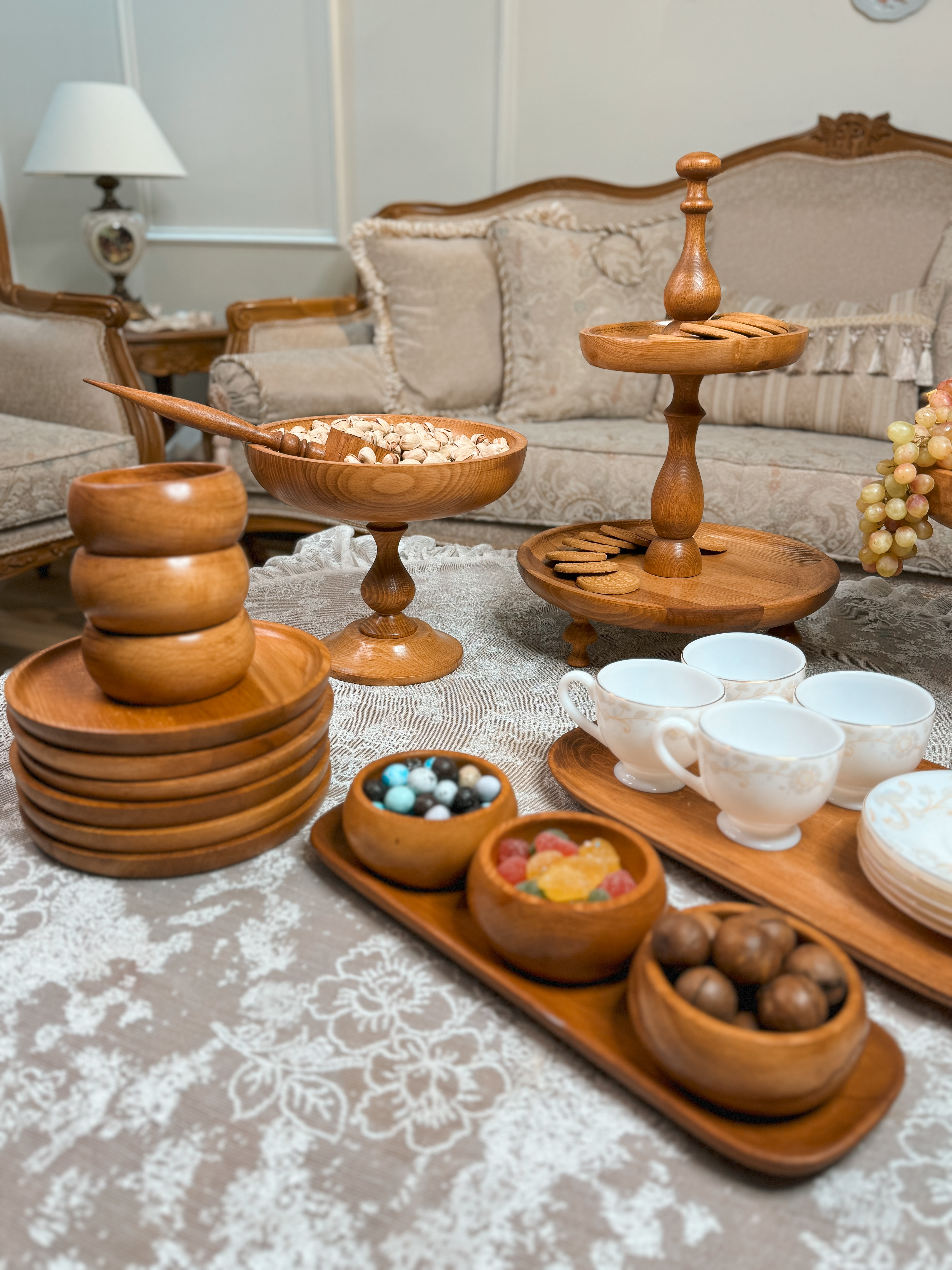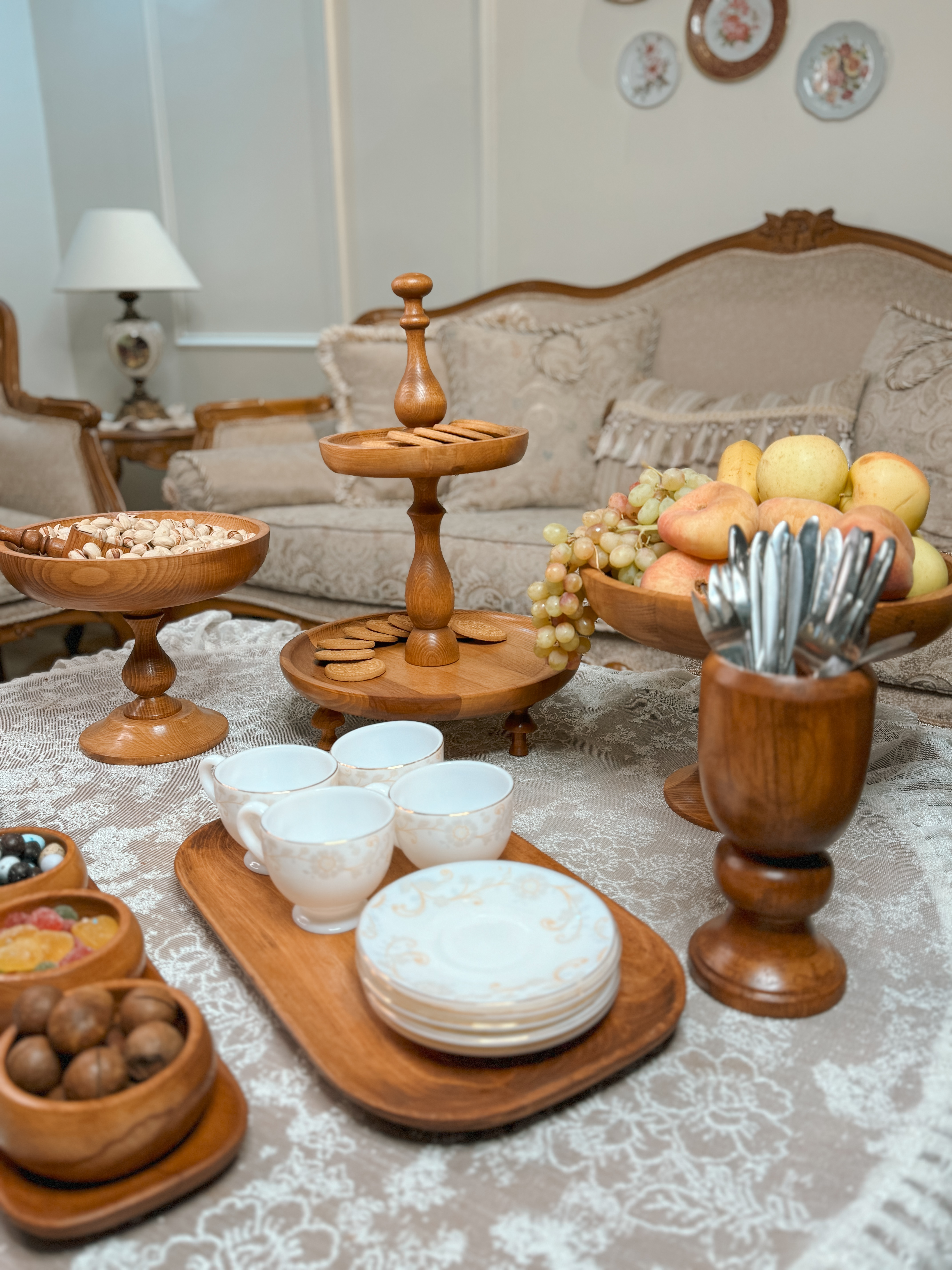 ساخته شده از چوب راش گرجستان با پوشش گیاهی و قابل شستشو اجزا این سرویس تشکیل شده از میوه خوری ۲۹سانتیمتر،آجیل خوری ۲۴سانتیمتر و شیرینی خوری ۲۹سانتیمتر،سینی به ابعاد ۲۵/۴۰ سانتیمترو رولت خوری به ابعاد ۱۲/۳۸سانتیمتر ،پیش دستی قطر۲۰ سانتیمتر به تعداد ۶عدد و پیاله قطر۱۰سانتیمتر به تعداد ۶ عددو استند دو طبقه به قطرهای ۱۹/۲۹ سانتیمتر،جای کاردو چنگال و قاشق آجیل می باشد 📍نکته :تفاوت رنگ در محصولات چوبی ماچوب یک متریال طبیعی و زنده است که دارای بافتها، رگهها و گرههای منحصربهفردیست. این ویژگیها باعث میشود هر قطعه چوب، رنگ و طرح خاص خود را داشته باشد و در نتیجه، ظروف چوبی ما نیز ممکن است تفاوتهایی در رنگ و بافت نسبت به یکدیگر داشته باشند؛ بهویژه در محصولات با رنگ عسلـی، این تفاوت بیشتر نمود پیدا میکند.برای شفافیت بیشتر، تصاویر واقعی و بدون ویرایش تمامی سفارشهای آماده ارسال، در صفحه دوم اینستاگراممان (@kajanchoob2) قرار داده شدهاند تا بتوانید نمای دقیقتری از تنوع طبیعی محصولات داشته باشید.امیدواریم مشاهده این تصاویر، شما را در انتخاب بهتر یاری کند.