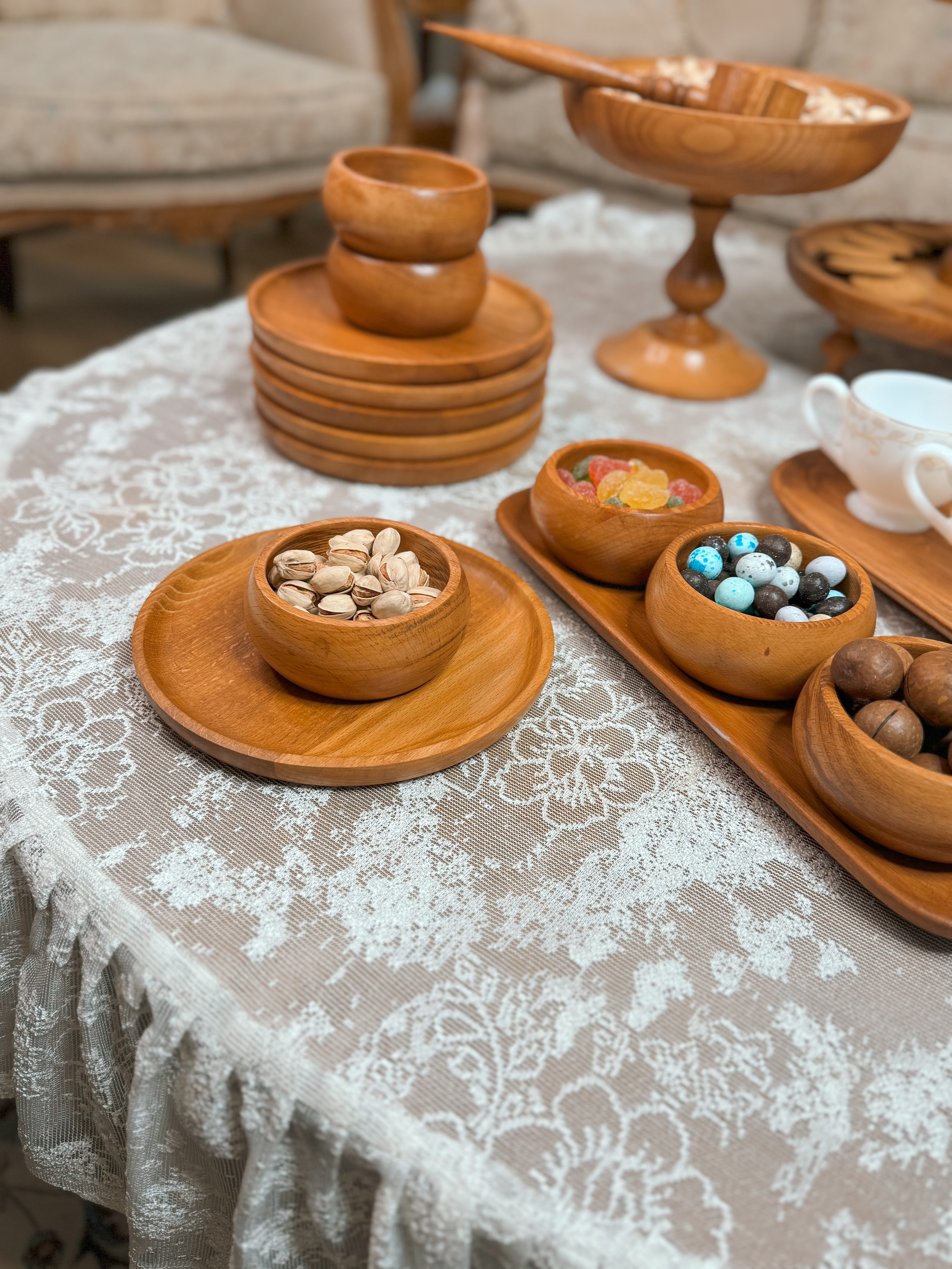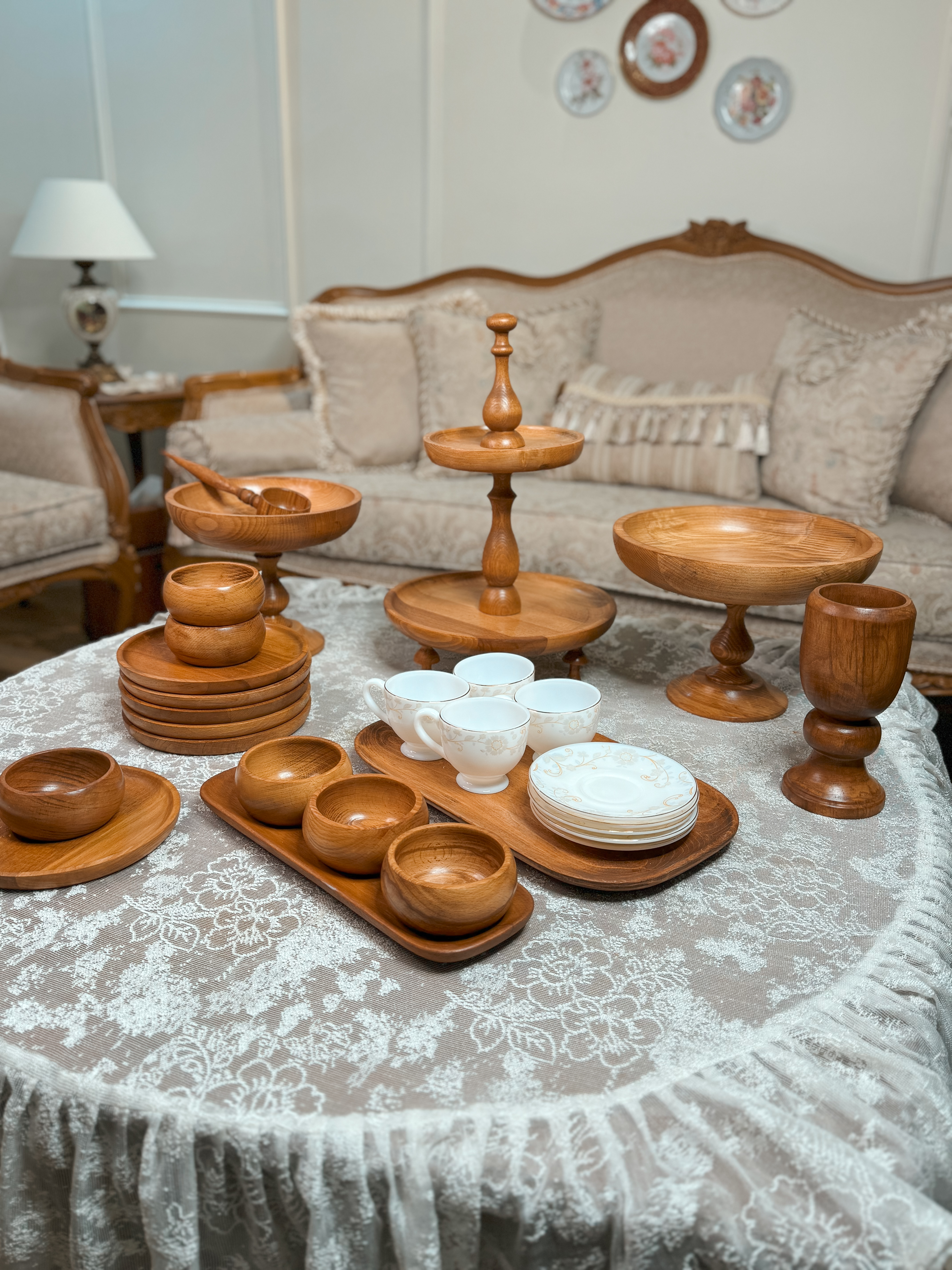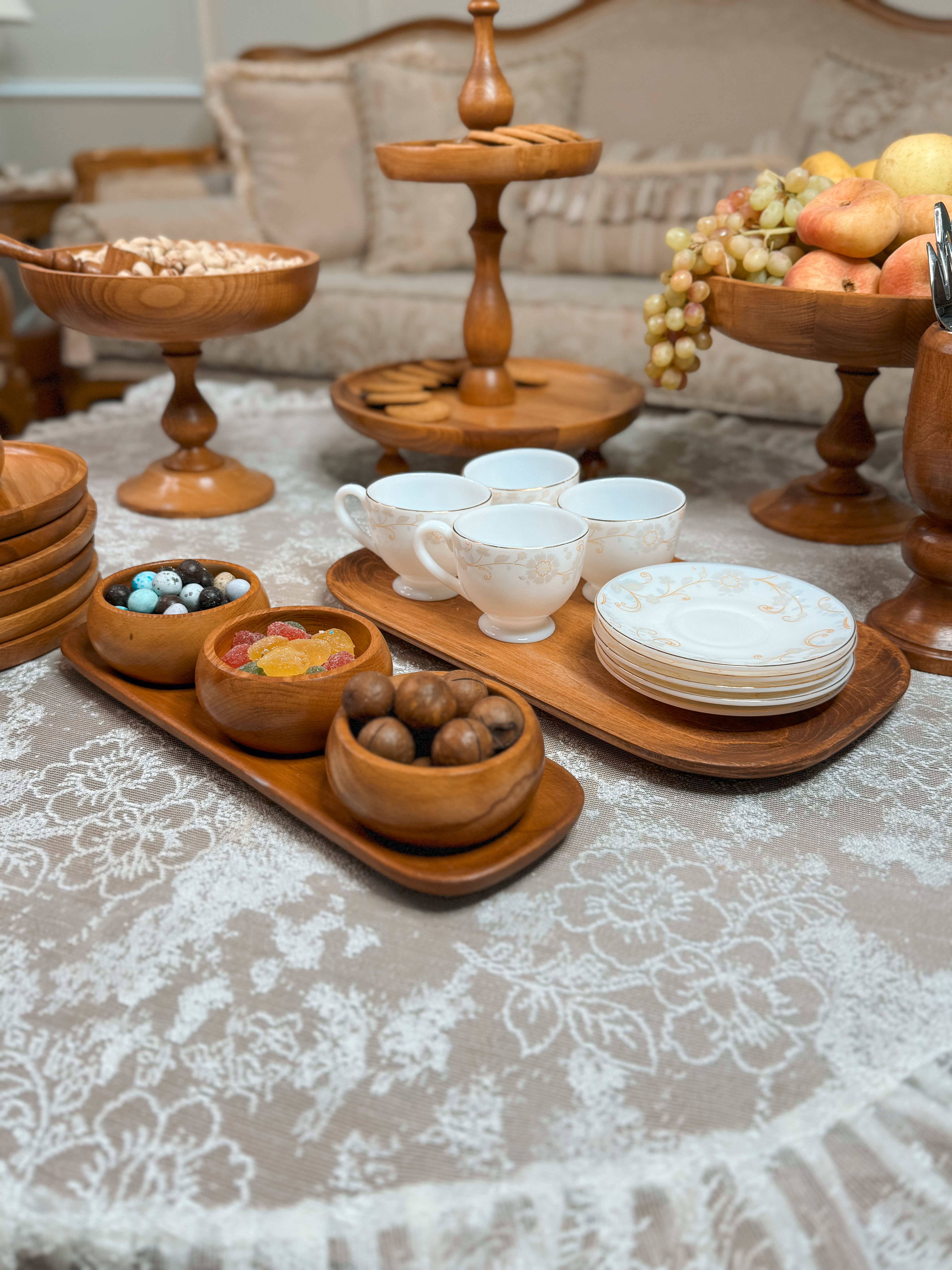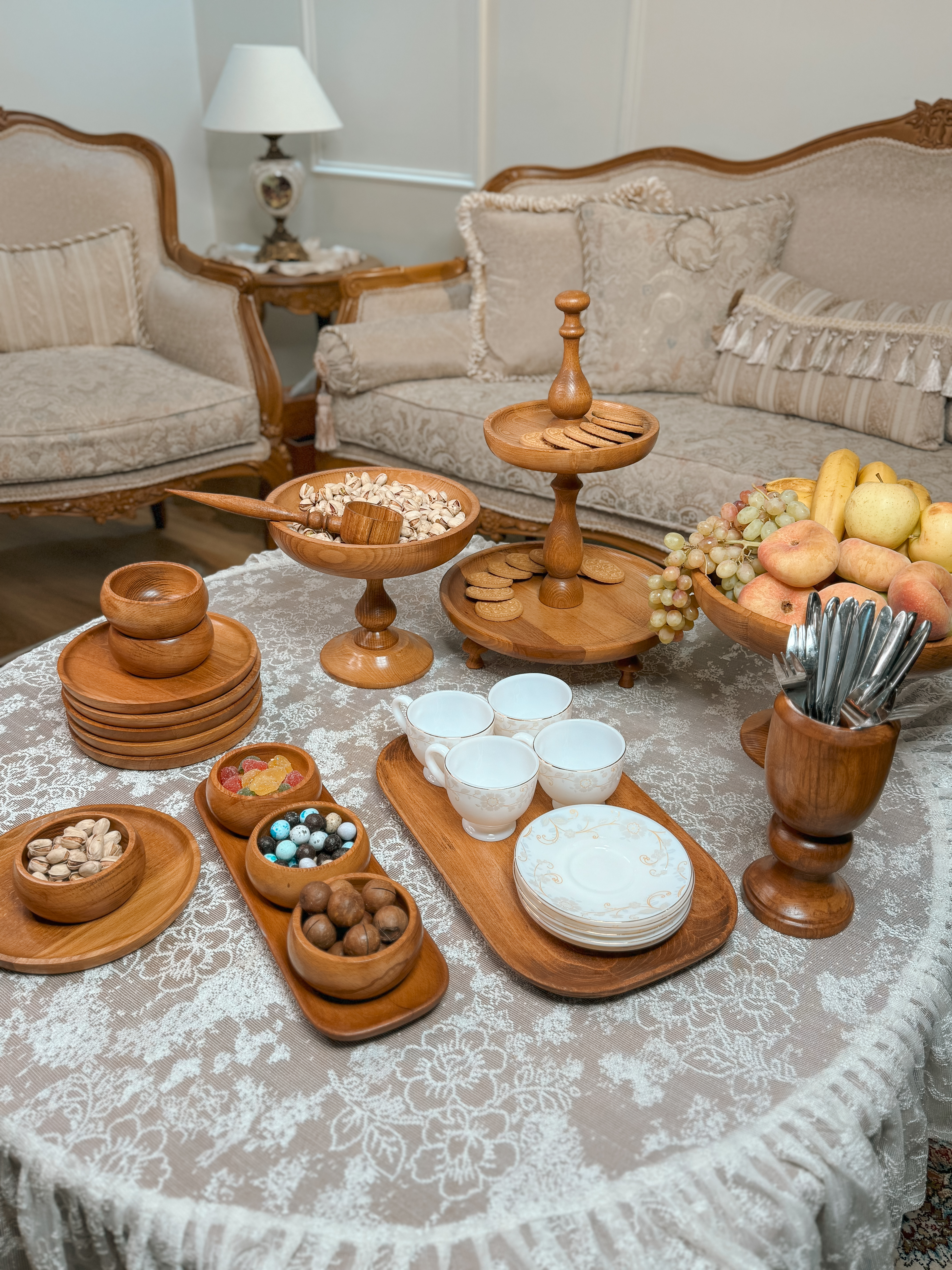 ساخته شده از چوب راش گرجستان با پوشش گیاهی و قابل شستشو اجزا این سرویس تشکیل شده از میوه خوری ۲۹سانتیمتر،آجیل خوری ۲۴سانتیمتر و شیرینی خوری ۲۹سانتیمتر،سینی به ابعاد ۲۵/۴۰ سانتیمترو رولت خوری به ابعاد ۱۲/۳۸سانتیمتر ،پیش دستی قطر۲۰ سانتیمتر به تعداد ۶عدد و پیاله قطر۱۰سانتیمتر به تعداد ۶ عددو استند دو طبقه به قطرهای ۱۹/۲۹ سانتیمتر،جای کاردو چنگال و قاشق آجیل می باشد 📍نکته :تفاوت رنگ در محصولات چوبی ماچوب یک متریال طبیعی و زنده است که دارای بافتها، رگهها و گرههای منحصربهفردیست. این ویژگیها باعث میشود هر قطعه چوب، رنگ و طرح خاص خود را داشته باشد و در نتیجه، ظروف چوبی ما نیز ممکن است تفاوتهایی در رنگ و بافت نسبت به یکدیگر داشته باشند؛ بهویژه در محصولات با رنگ عسلـی، این تفاوت بیشتر نمود پیدا میکند.برای شفافیت بیشتر، تصاویر واقعی و بدون ویرایش تمامی سفارشهای آماده ارسال، در صفحه دوم اینستاگراممان (@kajanchoob2) قرار داده شدهاند تا بتوانید نمای دقیقتری از تنوع طبیعی محصولات داشته باشید.امیدواریم مشاهده این تصاویر، شما را در انتخاب بهتر یاری کند.
