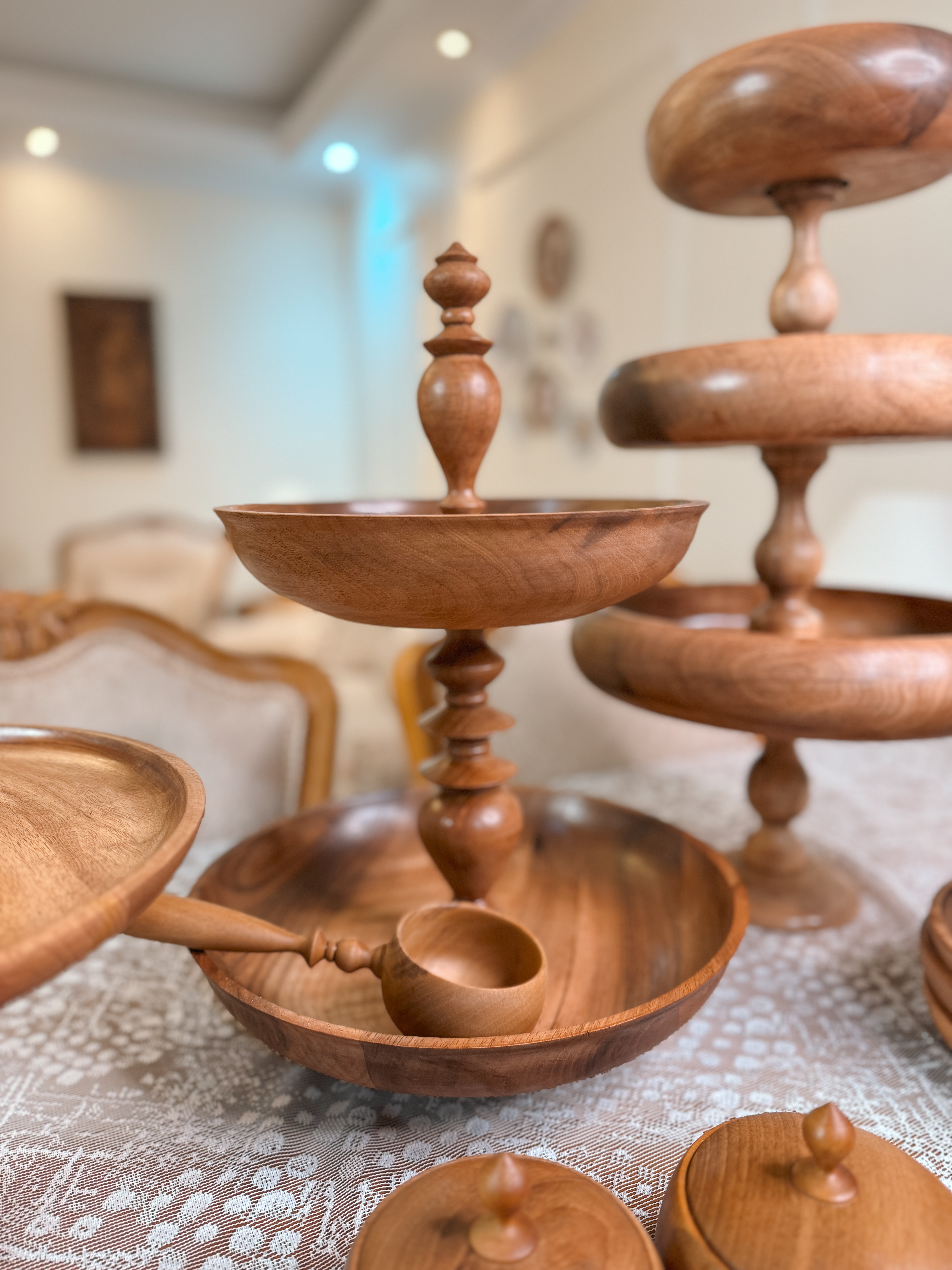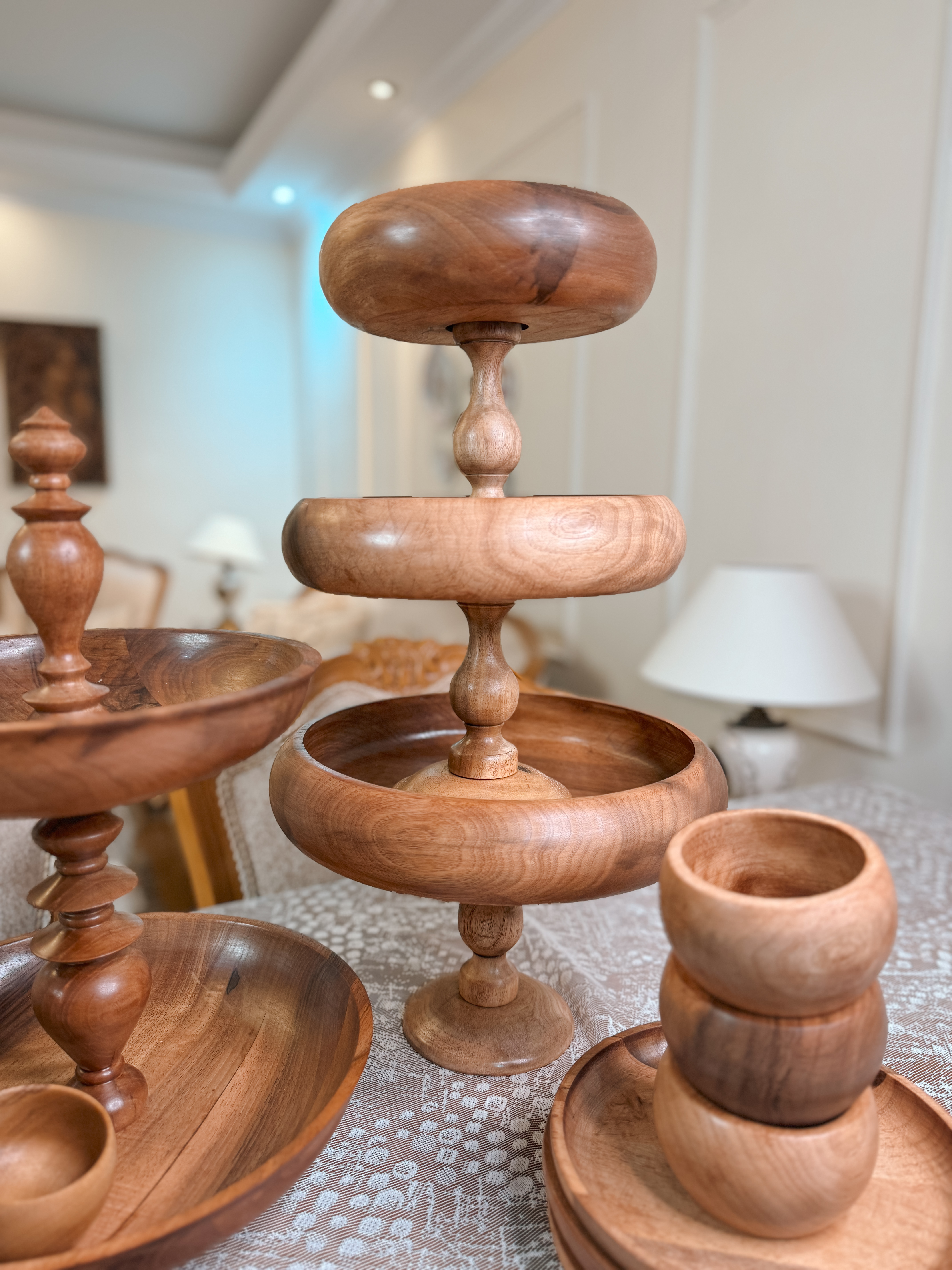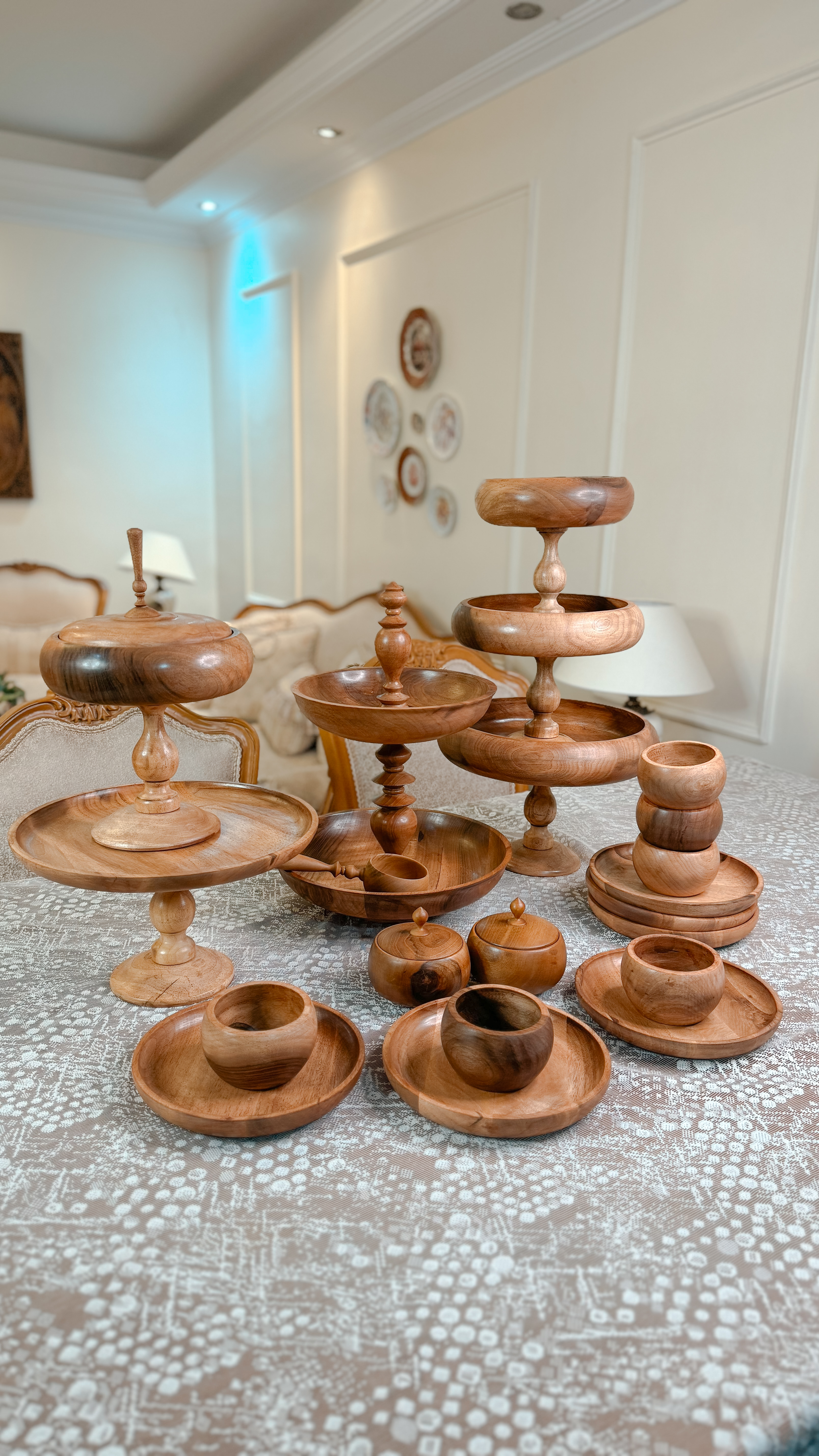 ساخته شده از چوب گردو با پوشش گیاهی و قابل شستشو اجزا سرویس تشکیل شده از سه کاسه پایه دار به قطر های ۳۰/۲۵/۲۰ سانتیمتر که مناسب میوه ، آجیل،شکلات و انواع سرو می باشد و یک شکلات خوری درب دار قطر ۲۰ سانتیمتر ،شیرینی خوری۳۰سانتیمتر و استند دو طبقه گود ۲۵/۳۰ سانتیمتر و دو عدد قندان ۱۲سانتیمتر و یک عدد قاشق آجیل می باشد۶عدد پیش دستی ۲۰ سانتیمتر و ۶عدد پیاله ۱۰ سانتیمتر می باشد تمامی پایه ها مونتاژی می باشند و شما با پایه و بدون پایه میتونید استفاده کنید