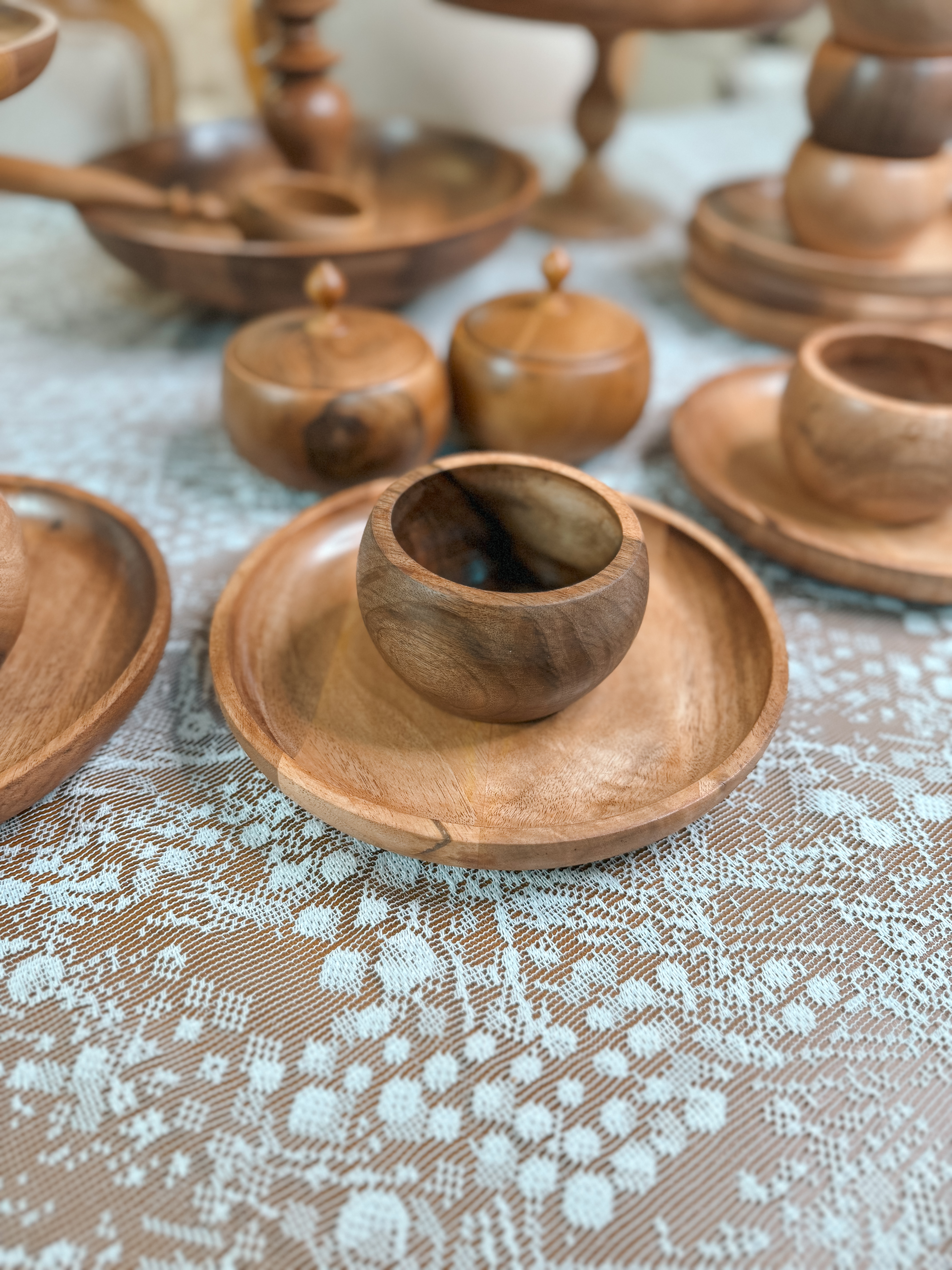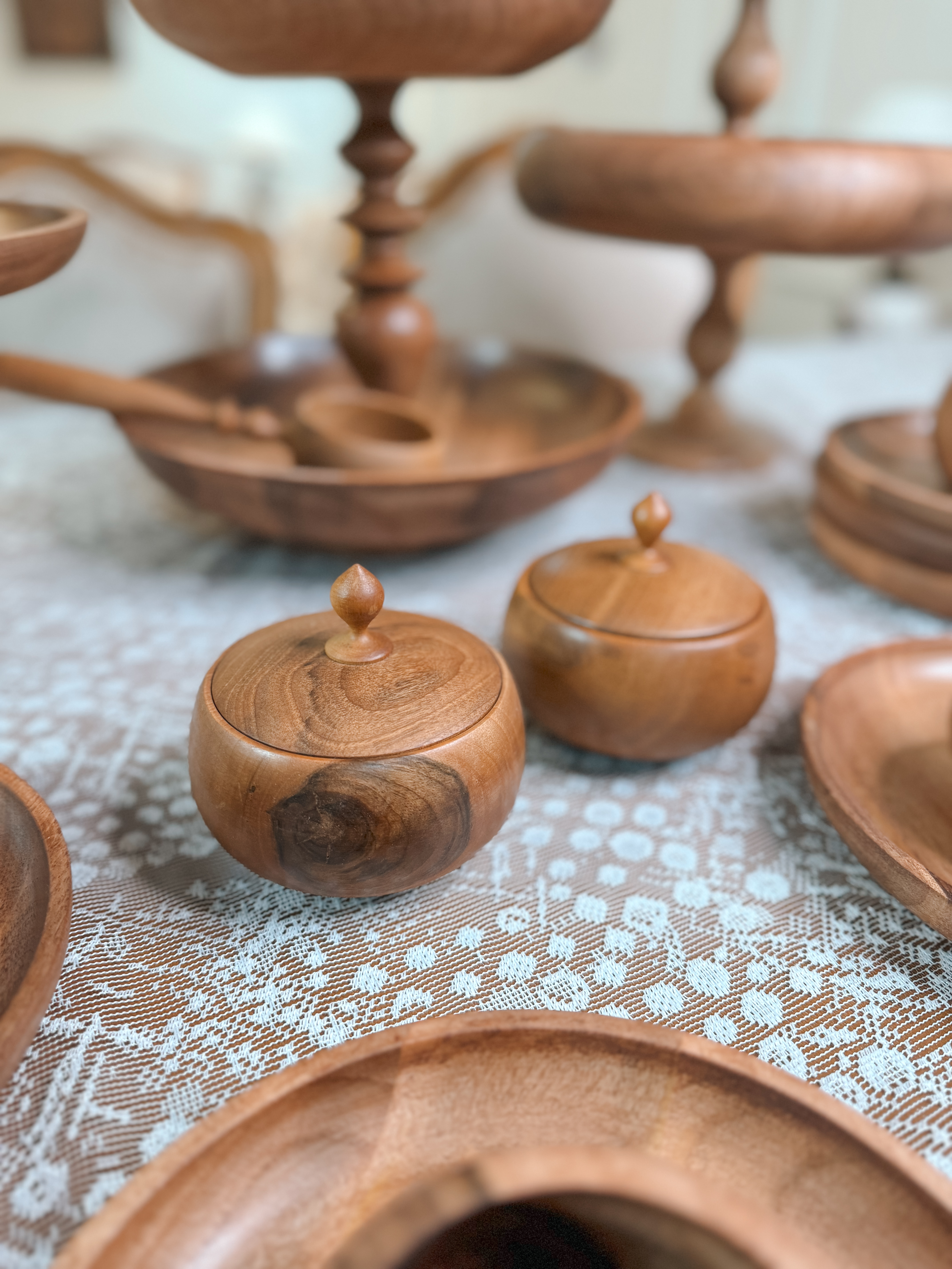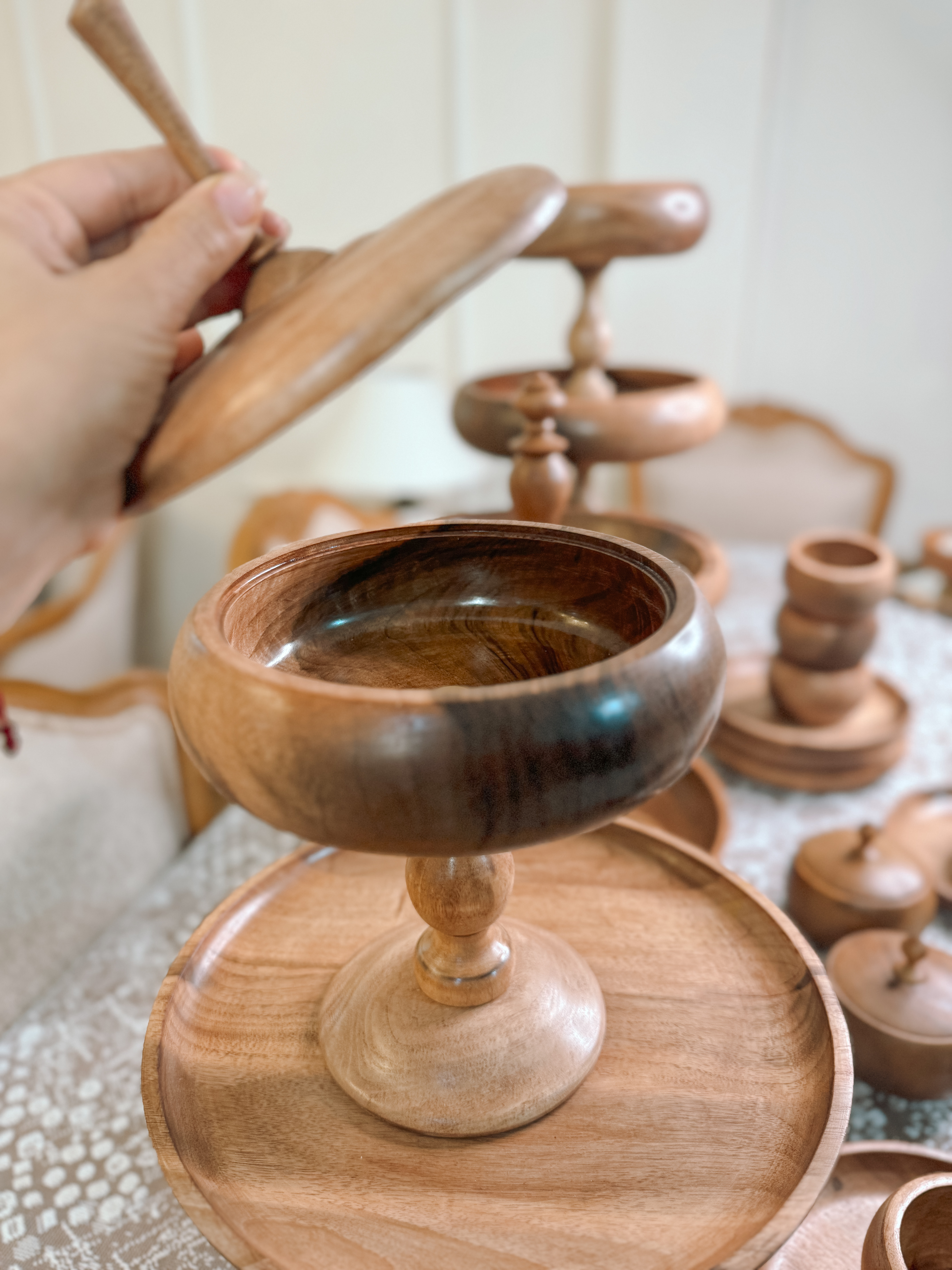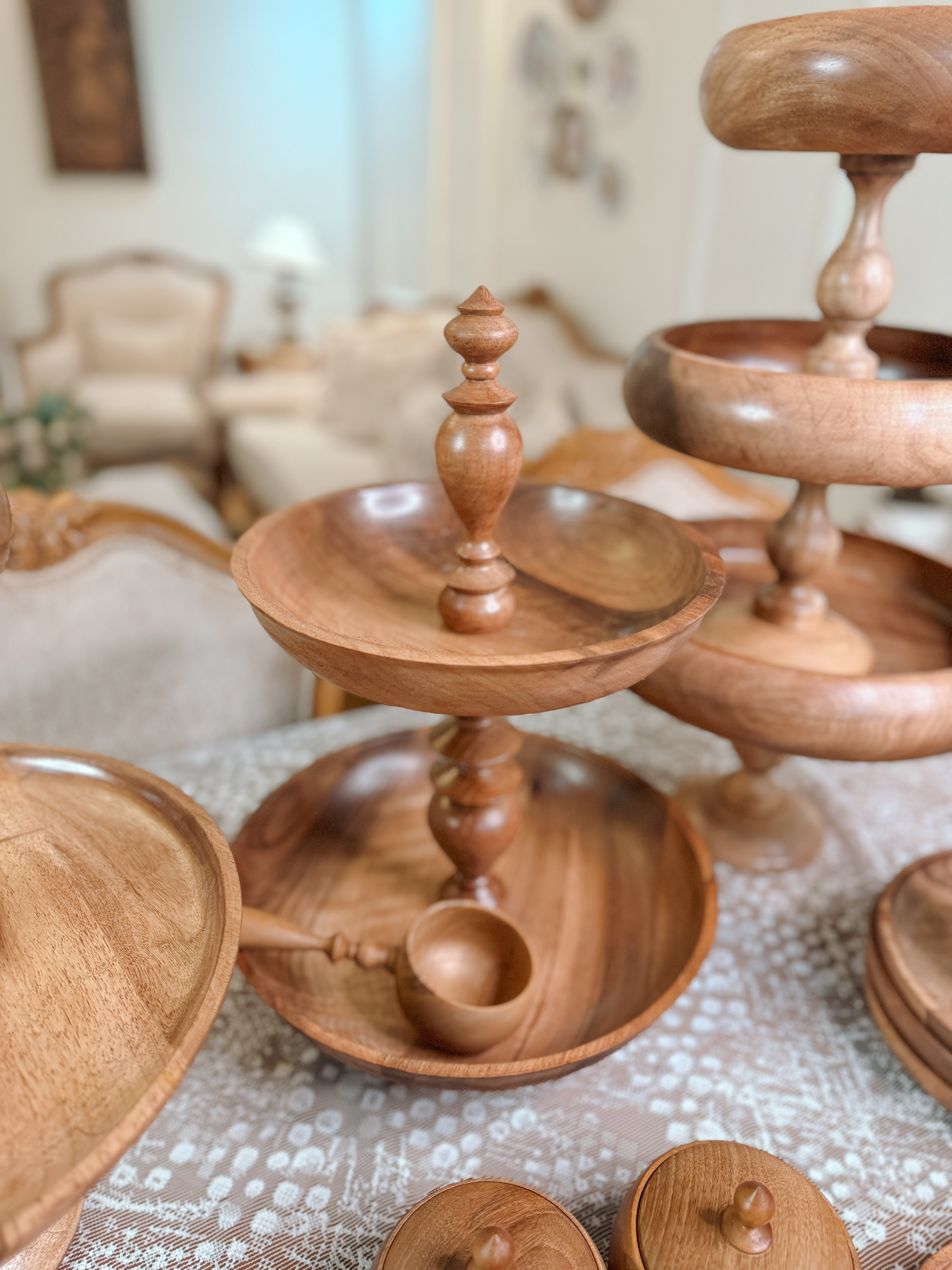 ساخته شده از چوب گردو با پوشش گیاهی و قابل شستشو اجزا سرویس تشکیل شده از سه کاسه پایه دار به قطر های ۳۰/۲۵/۲۰ سانتیمتر که مناسب میوه ، آجیل،شکلات و انواع سرو می باشد و یک شکلات خوری درب دار قطر ۲۰ سانتیمتر ،شیرینی خوری۳۰سانتیمتر و استند دو طبقه گود ۲۵/۳۰ سانتیمتر و دو عدد قندان ۱۲سانتیمتر و یک عدد قاشق آجیل می باشد۶عدد پیش دستی ۲۰ سانتیمتر و ۶عدد پیاله ۱۰ سانتیمتر می باشد تمامی پایه ها مونتاژی می باشند و شما با پایه و بدون پایه میتونید استفاده کنید