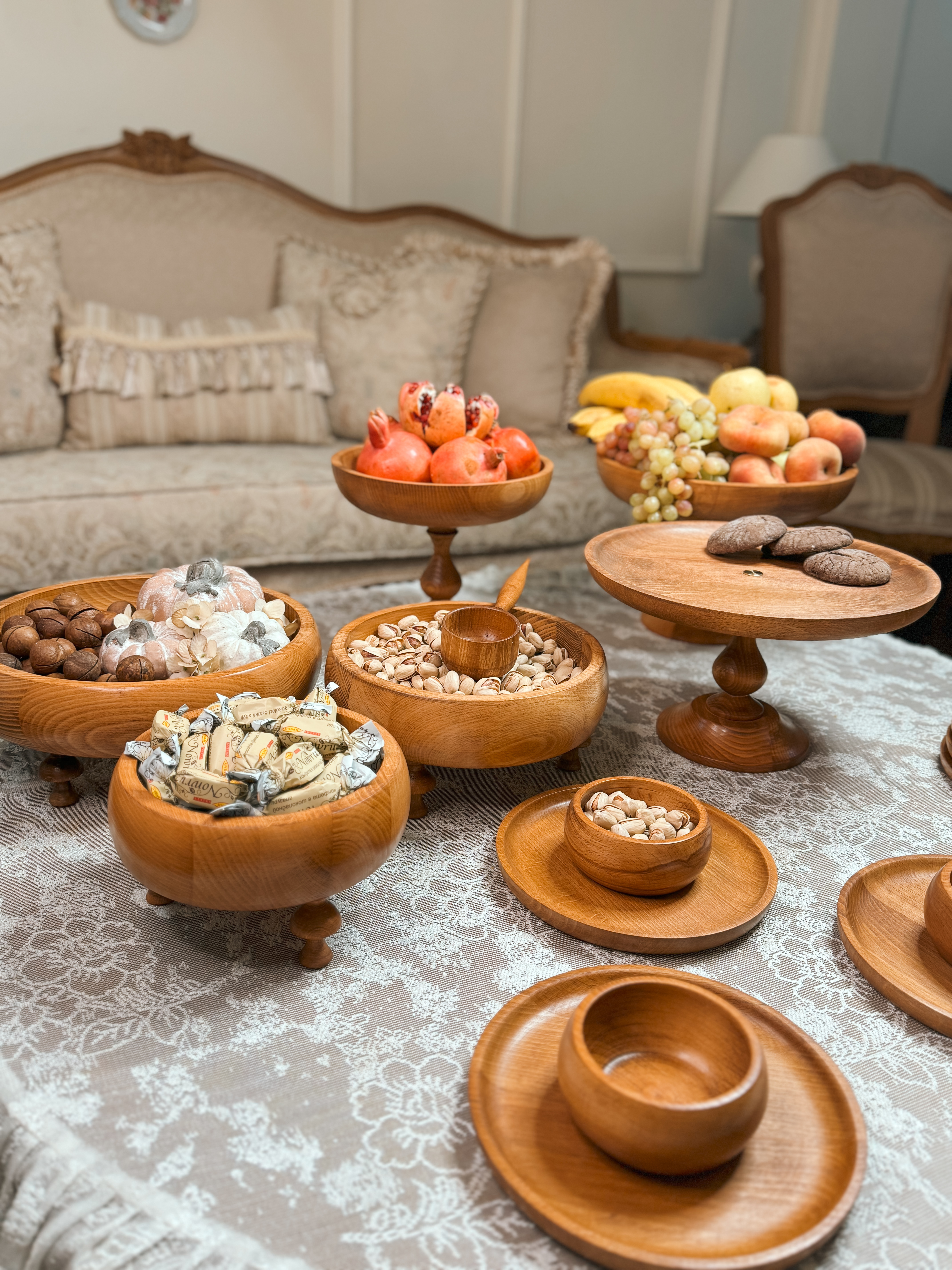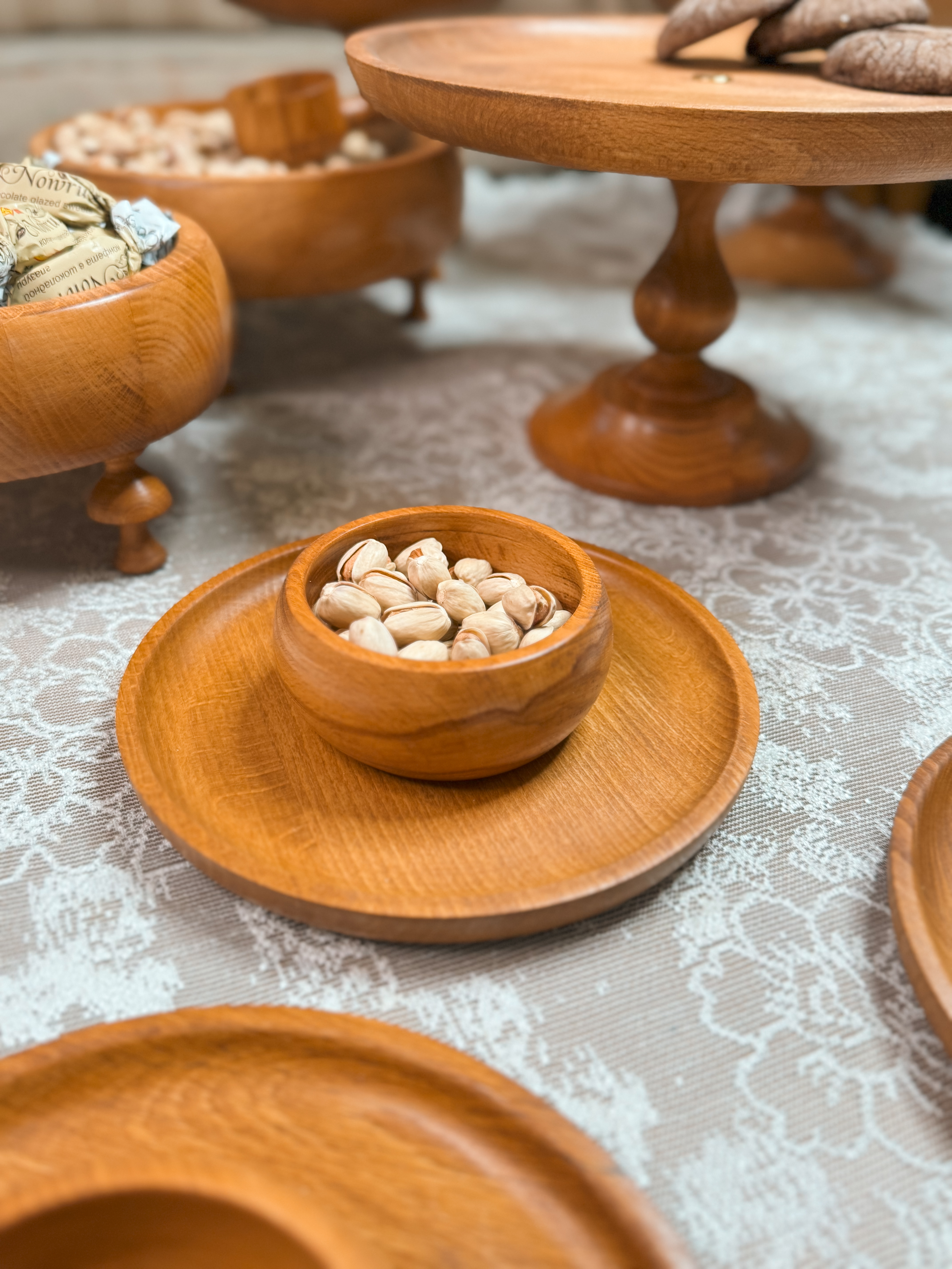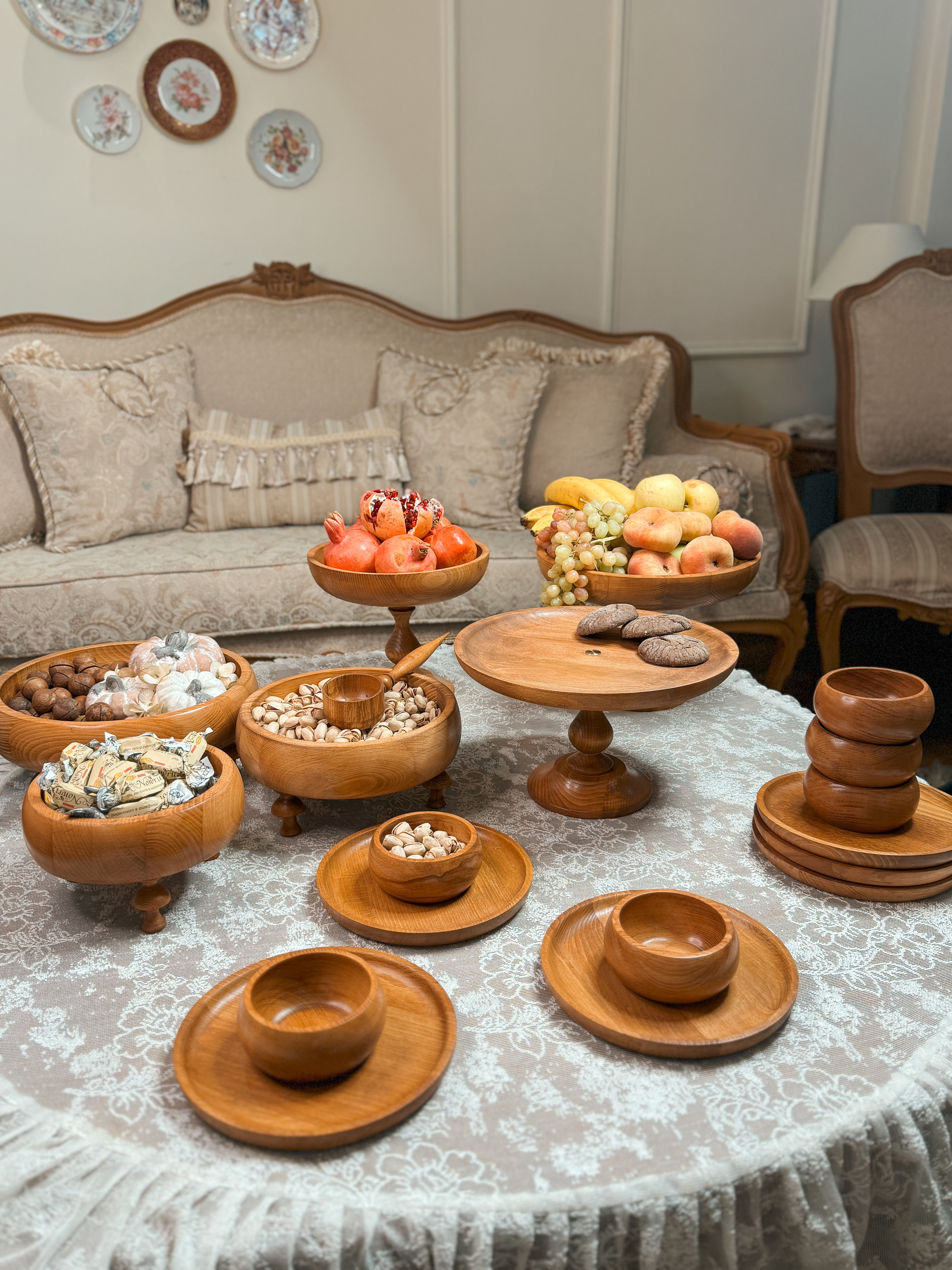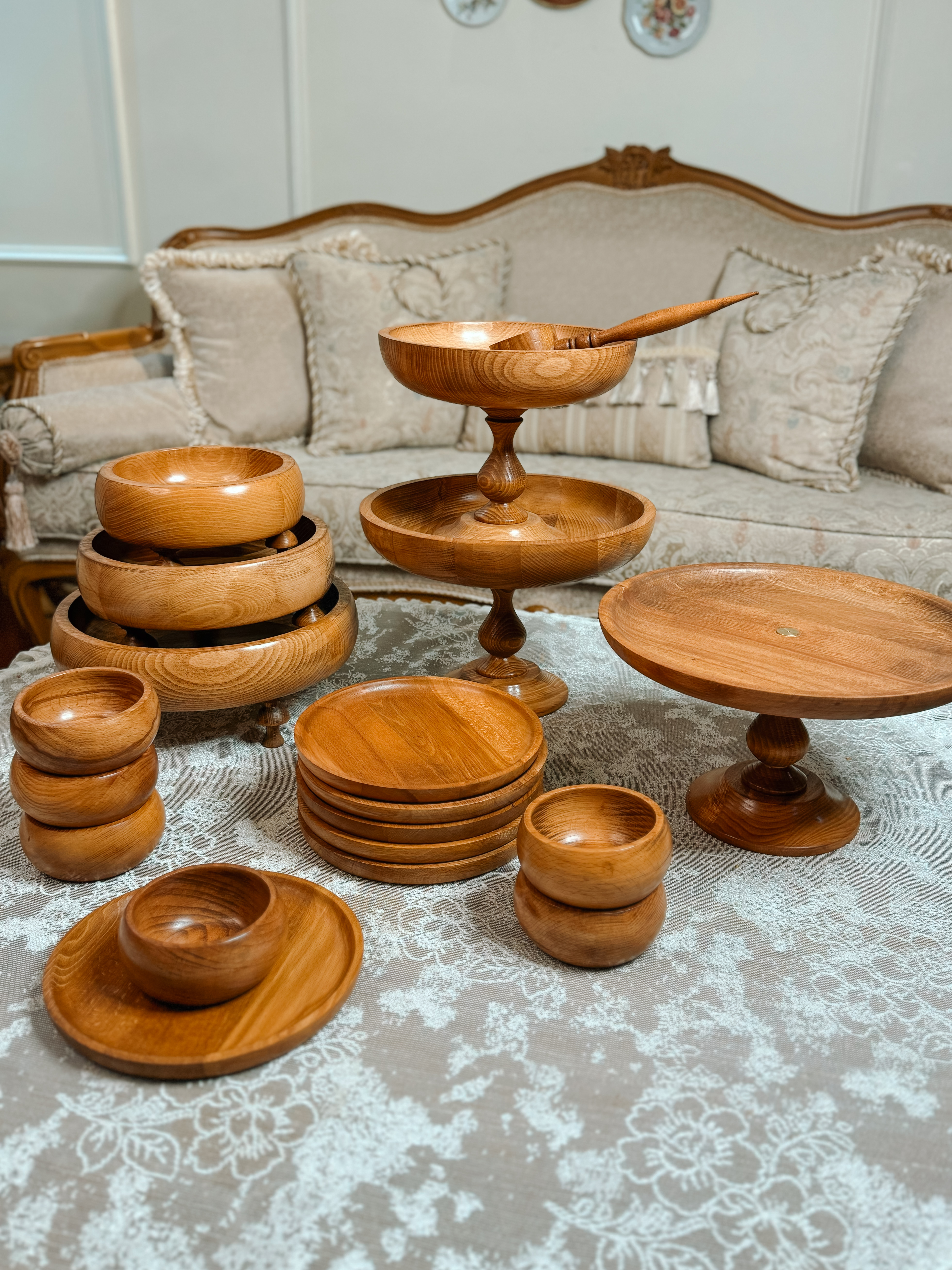 ساخته شده از چوب راش گرجستان با پوشش گیاهی و آب گریز واین سرویس شامل دو عددکاسه تک پایه به قطر های ۲۹/۲۴ سانتیمتر،شیرینی خوری۲۹سانتیمترو ست سه تایی کاسه خمره ای به قطر های ۱۹/۲۴/۲۹سانتیمتر و شش عدد پیش دستی ۲۰ سانتیمترو شش عدد پیاله قطر۱۰ سانتیمتر می باشد به همراه قاشق آجیل.ظروف چند تیکه میباشدو پایه ها تماما مونتاژی هستند این قابلیتو داره که به دو صورت پایه دار و بدون پایه استفاده کرد