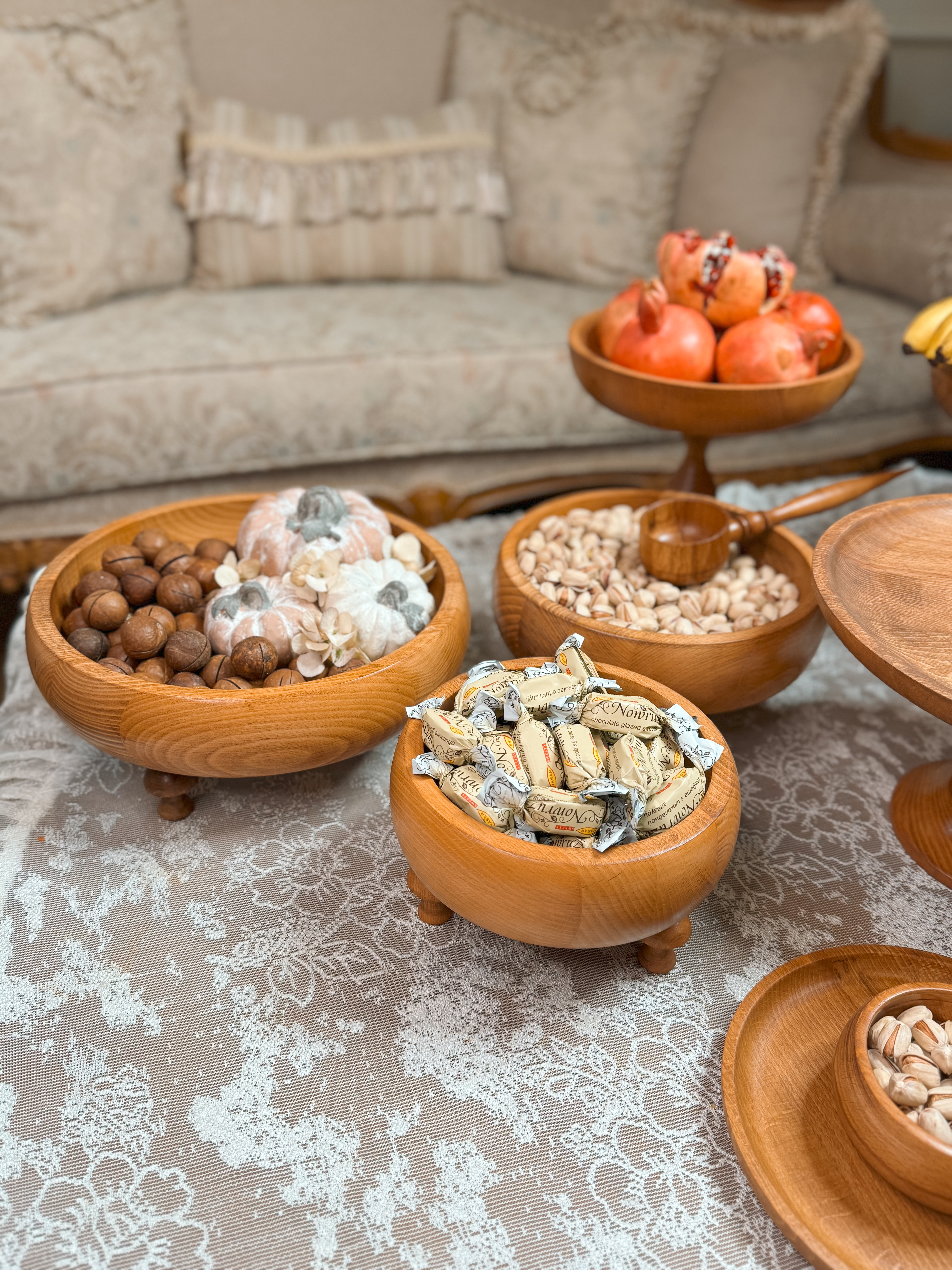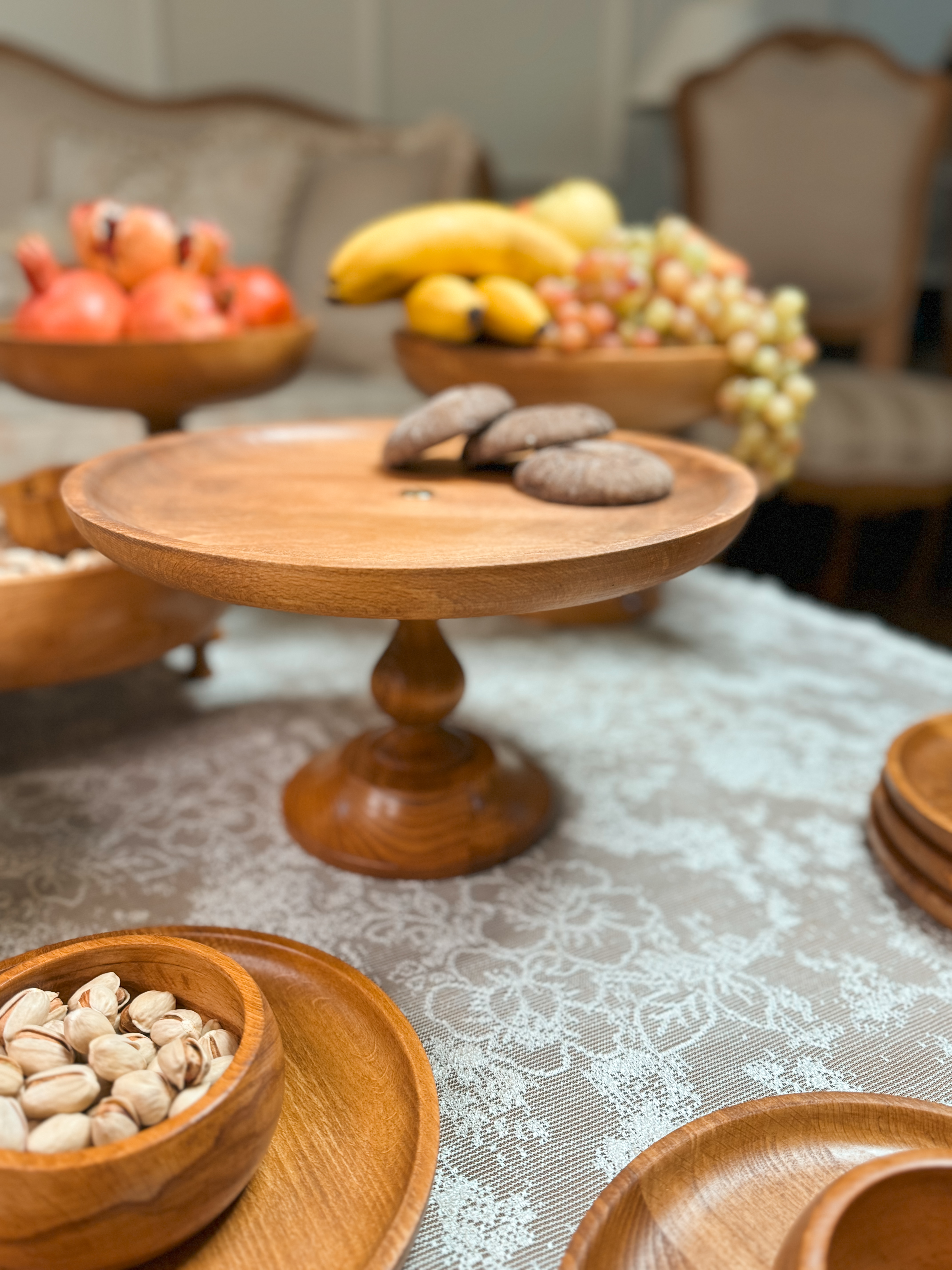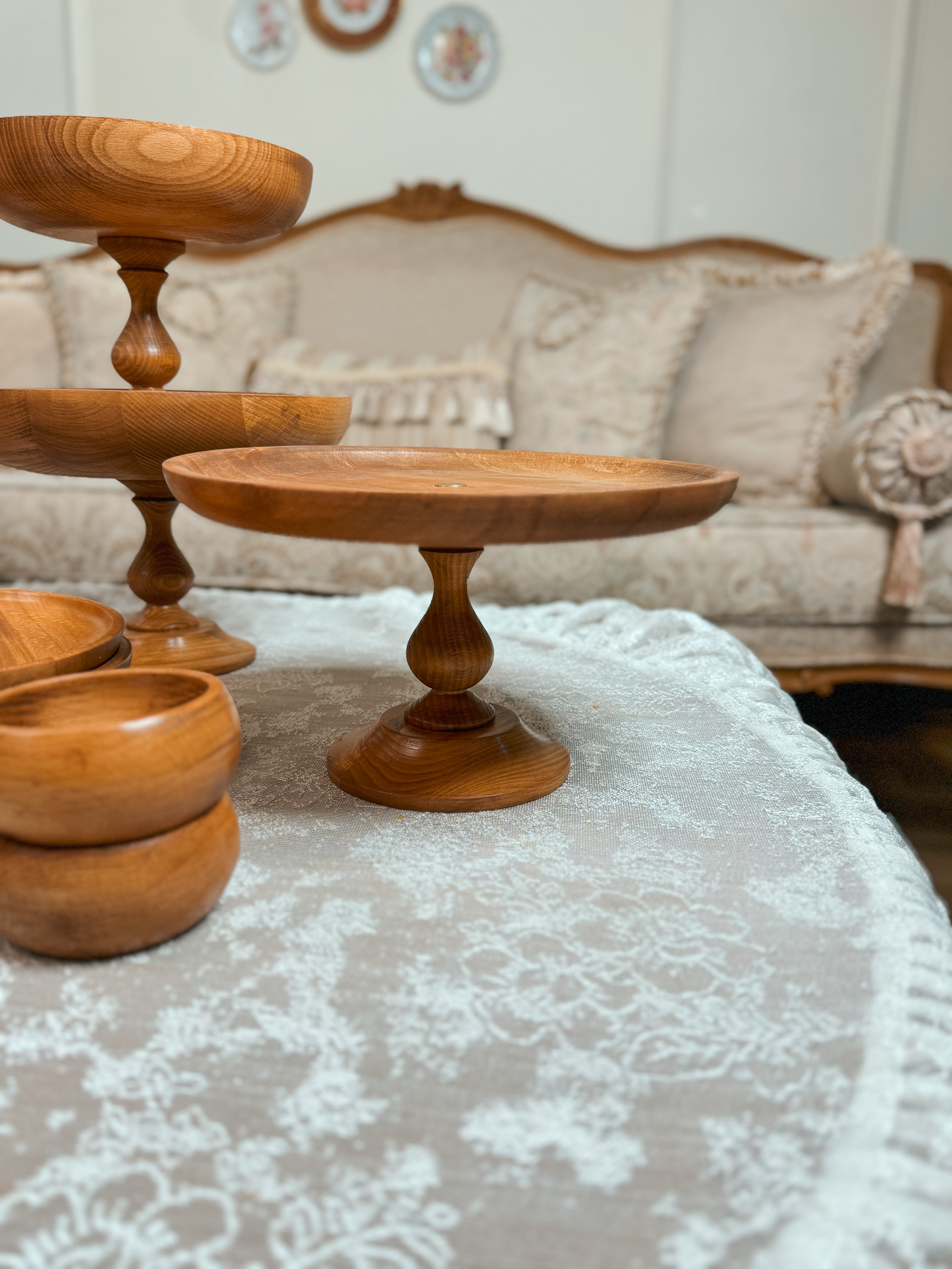 ساخته شده از چوب راش گرجستان با پوشش گیاهی و آب گریز واین سرویس شامل دو عددکاسه تک پایه به قطر های ۲۹/۲۴ سانتیمتر،شیرینی خوری۲۹سانتیمترو ست سه تایی کاسه خمره ای به قطر های ۱۹/۲۴/۲۹سانتیمتر و شش عدد پیش دستی ۲۰ سانتیمترو شش عدد پیاله قطر۱۰ سانتیمتر می باشد به همراه قاشق آجیل.ظروف چند تیکه میباشدو پایه ها تماما مونتاژی هستند این قابلیتو داره که به دو صورت پایه دار و بدون پایه استفاده کرد