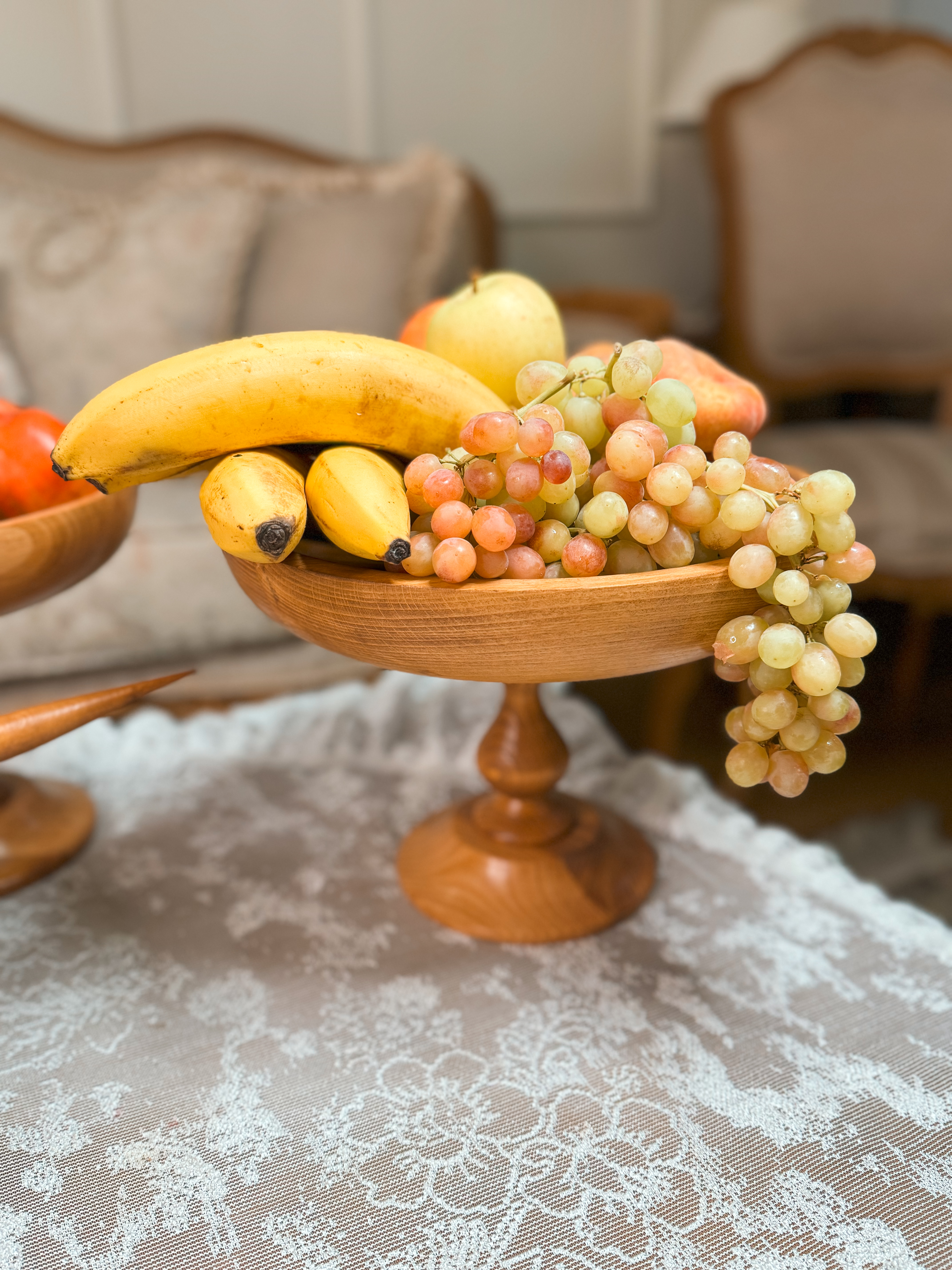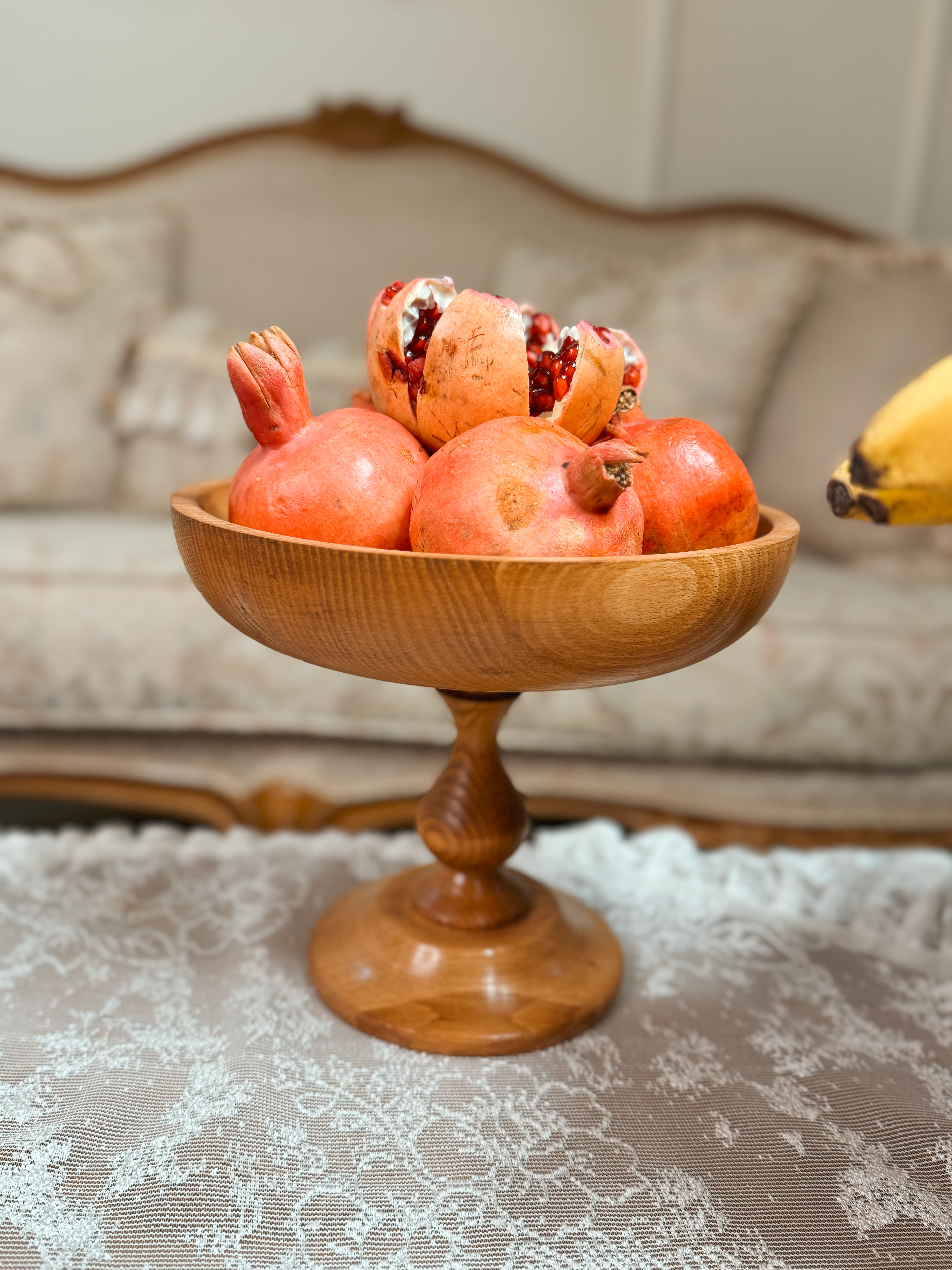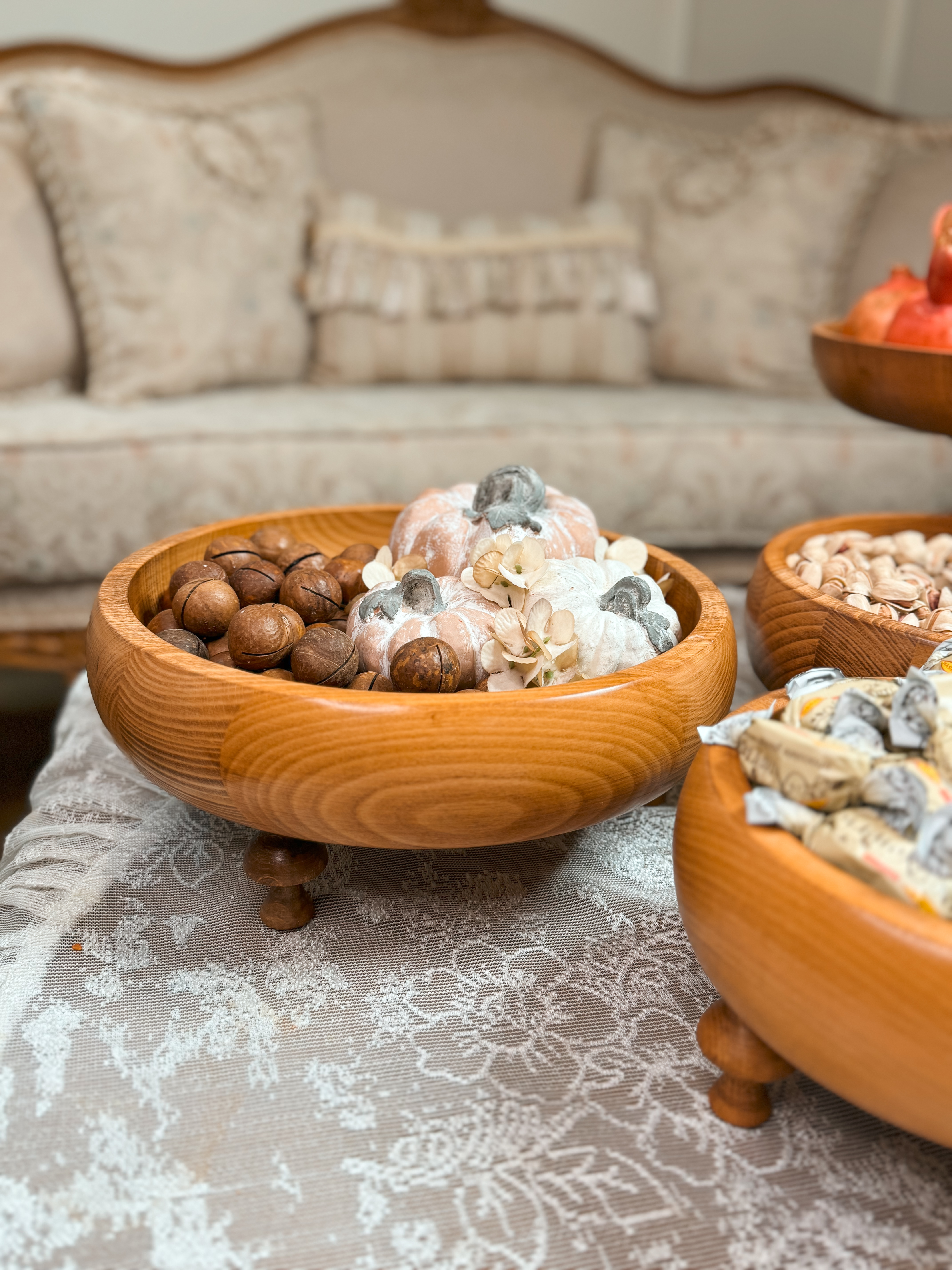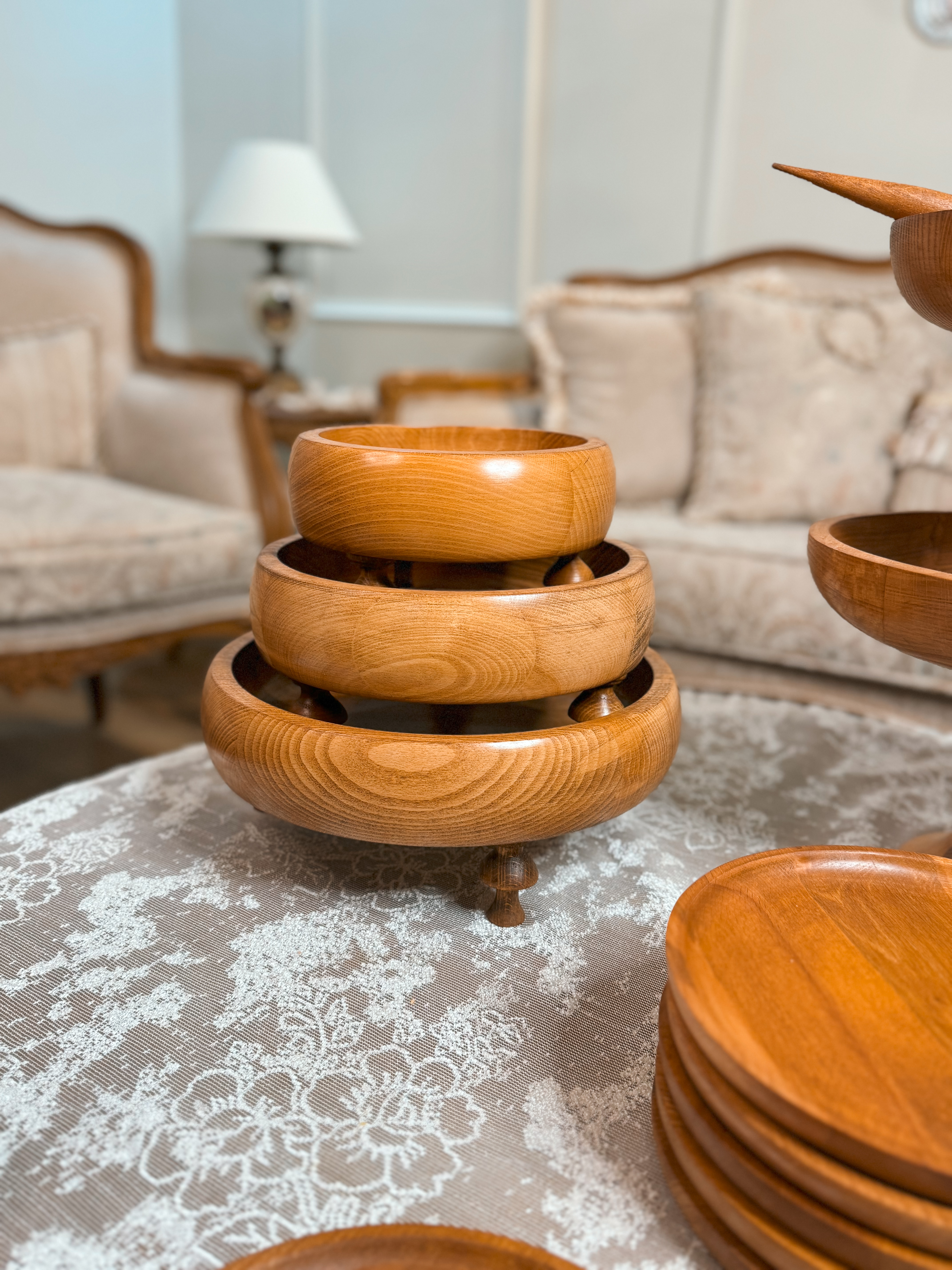 ساخته شده از چوب راش گرجستان با پوشش گیاهی و آب گریز واین سرویس شامل دو عددکاسه تک پایه به قطر های ۲۹/۲۴ سانتیمتر،شیرینی خوری۲۹سانتیمترو ست سه تایی کاسه خمره ای به قطر های ۱۹/۲۴/۲۹سانتیمتر و شش عدد پیش دستی ۲۰ سانتیمترو شش عدد پیاله قطر۱۰ سانتیمتر می باشد به همراه قاشق آجیل.ظروف چند تیکه میباشدو پایه ها تماما مونتاژی هستند این قابلیتو داره که به دو صورت پایه دار و بدون پایه استفاده کرد