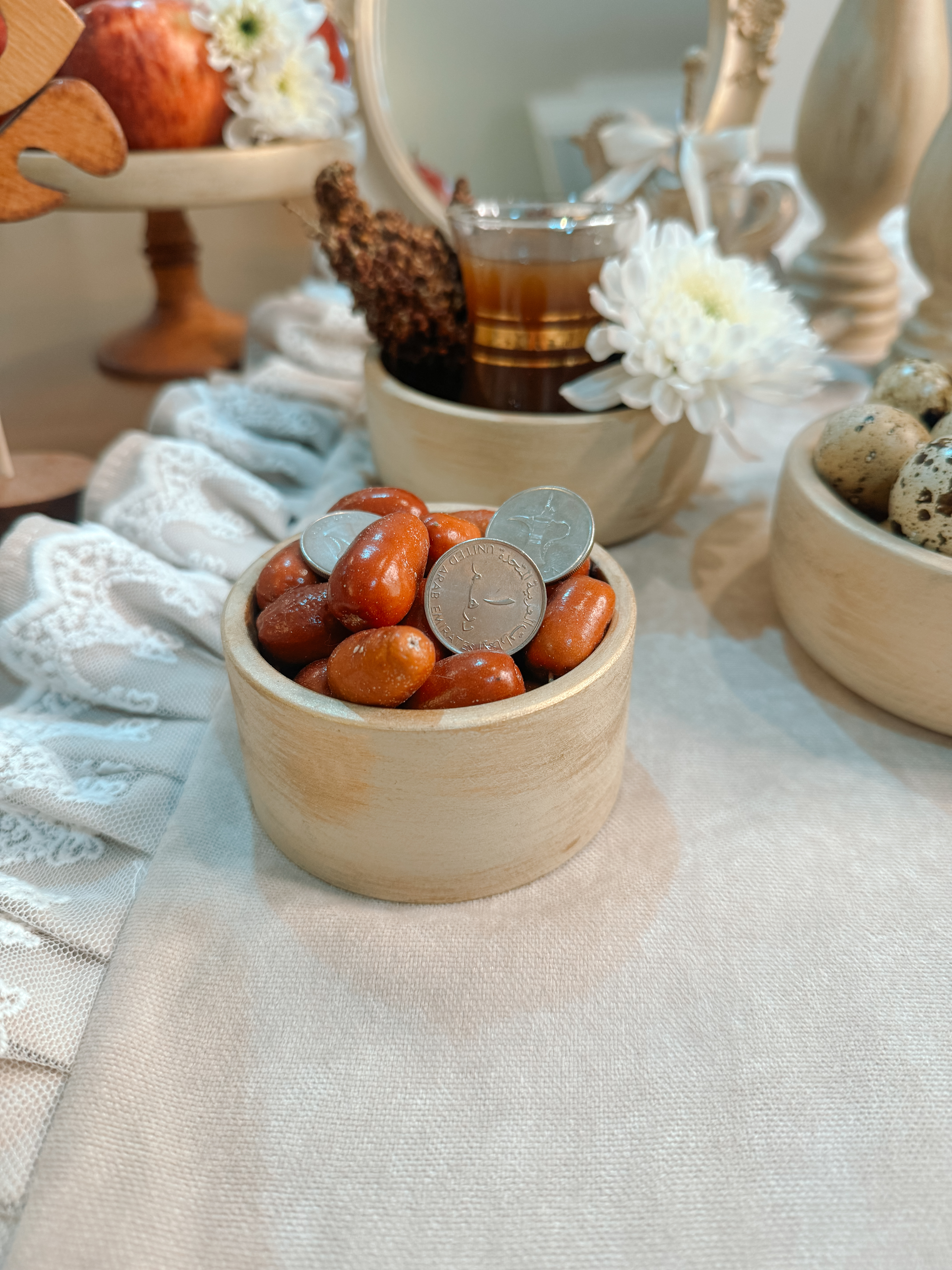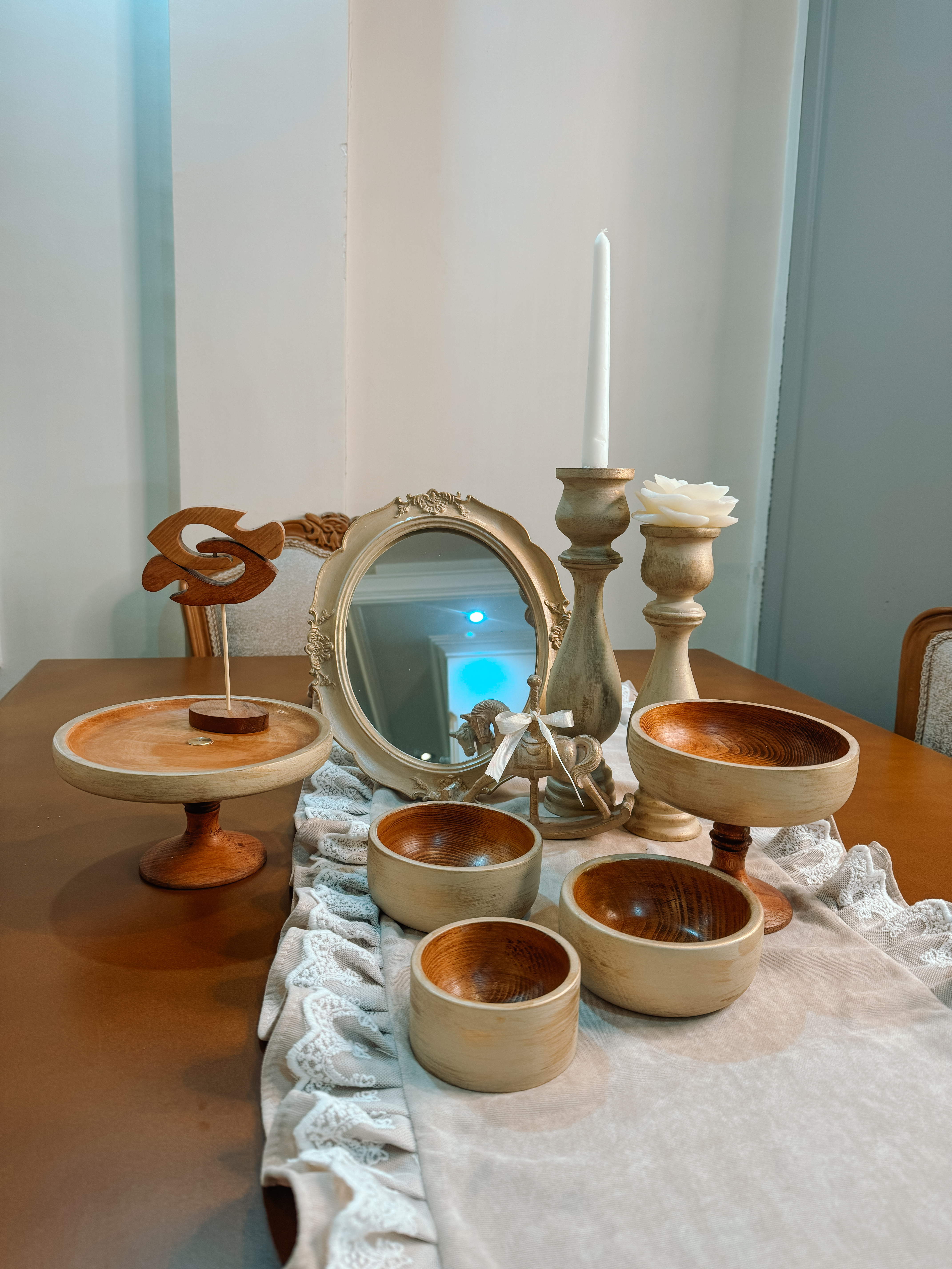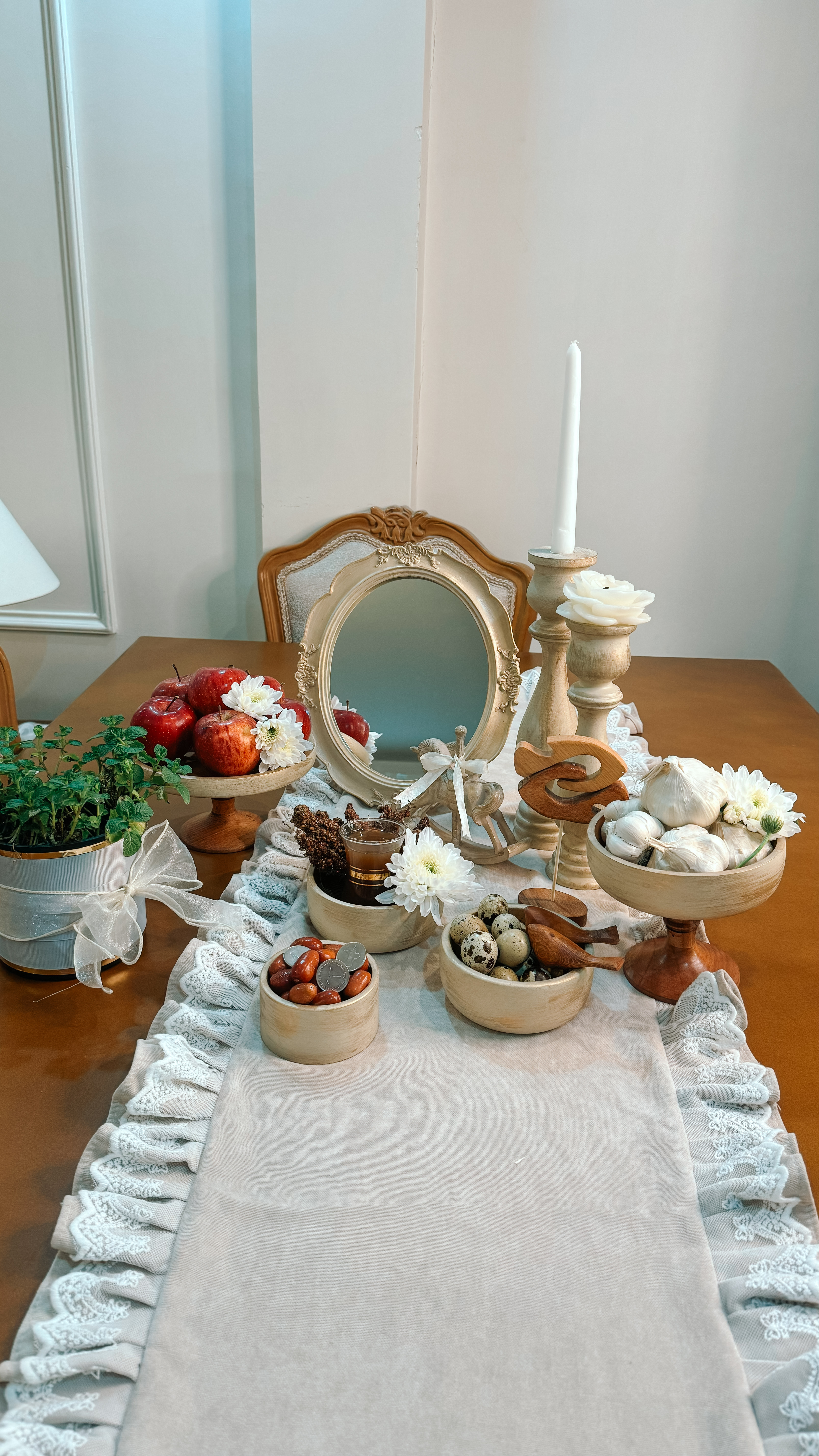 ساخته شده از چوب راش گرجستان داخل ظروف پوشش خوراکی دارد و بیرون ظروف رنگ کرم استخونی با تاچ های طلایی می باشد جنس آینه پلیستر می باشد.از هفت سین ها به عنوان ست دکوراتیو و ظروف پذیرایی هم می توان استفاده کرد که دراسلاید های آخر کاربردهای دیگر از اجزا عکس گذاشته شده .اجزا این هفتسین متشکل شده از آینه با جنس پلیستر ،جاشمعی ارتفاع ۲۵/۳۰سانت،ظرف سیر کاسه ۱۵ سانتیمتر میباش، ظرف سیب بشقاب ۱۹ سانتیمتر می باشد دو عدد پیاله ۱۲سانتیمتر و یک عدد پیاله ۹ سانتیمتر می باشدو یک استند ماهی و اسب راکر از جنس پلیستر به همراه دو عدد پرنده و دو عدد شمع در مدل های قلمی و رز می باشد